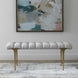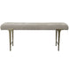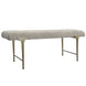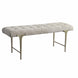 Influenced by traditional styling, the Imperial Bench's cushioned seat is upholstered in a light taupe woven polyester with biscuit tufting. The iron frame is finished in satin champagne.