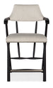 Organic, chic and comfy, the Stack Rock Counter Stool has a seat and back upholstered in the neutral texture Remington Porcelain fabric. The designer wood-framed silhouette and curved armrests are finished in Shadow, a charred black finish achieved through Shou Sugi Ban, a Japanese technique that creates a look resembling burnt wood. Nailhead trim adds crisp detail, and a metal-covered footrest adds more comfort.