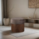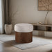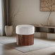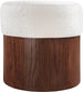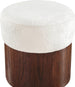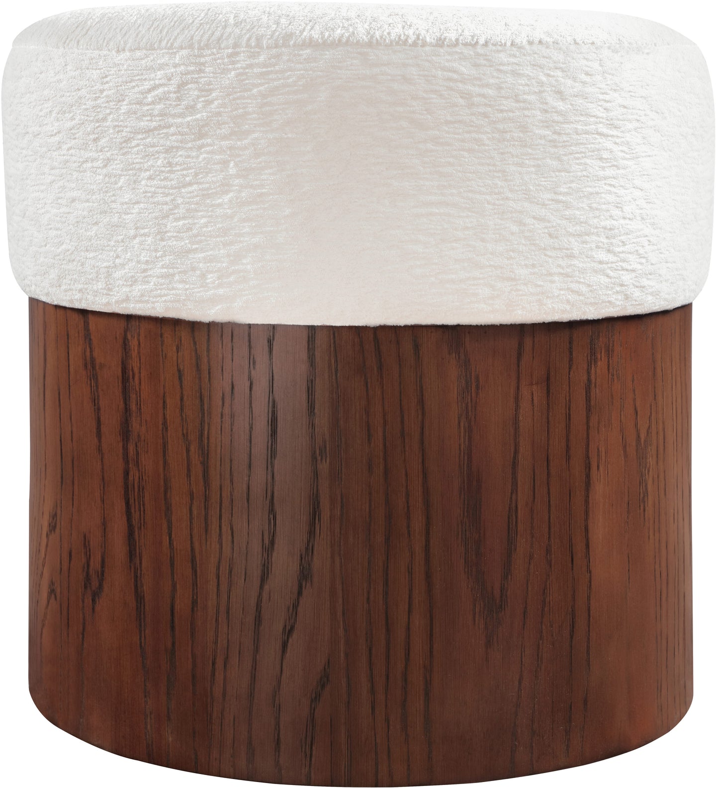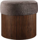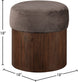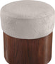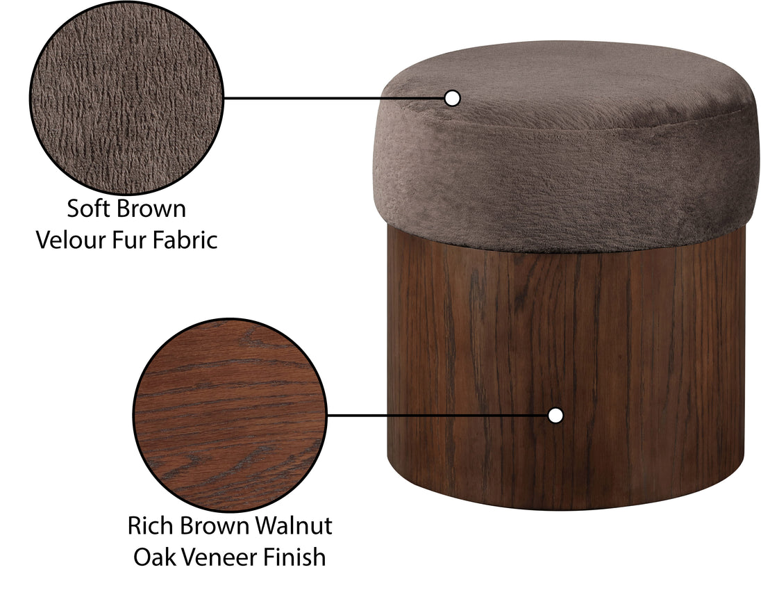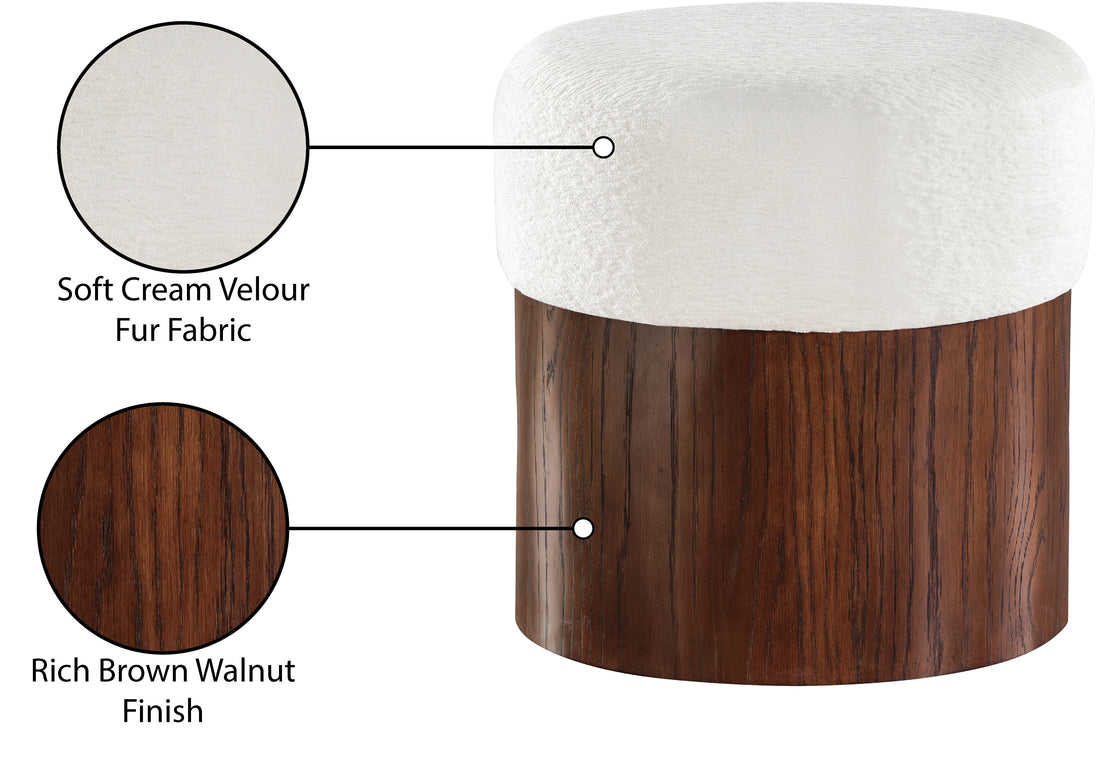 Strikingly modern, the Nimes beige velour fur fabric upholstered ottoman combines plush comfort with sleek design. The top is wrapped in luxurious velour fur fabric, offering a soft and inviting texture, while the cylindrical rich brown walnut wooden base provides a minimalist contrast. This versatile ottoman is perfect as extra seating, a footrest, or a stylish accent in any living space.