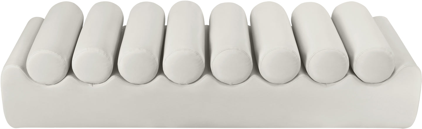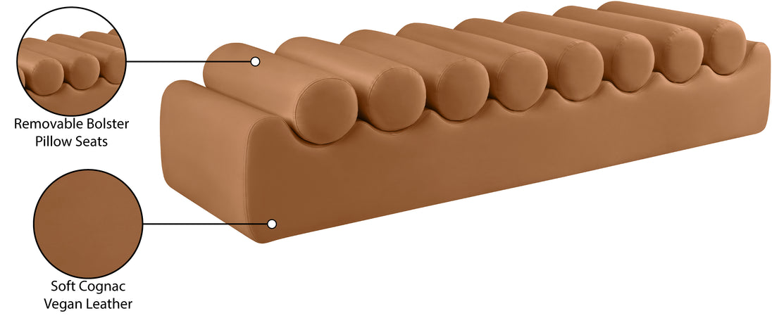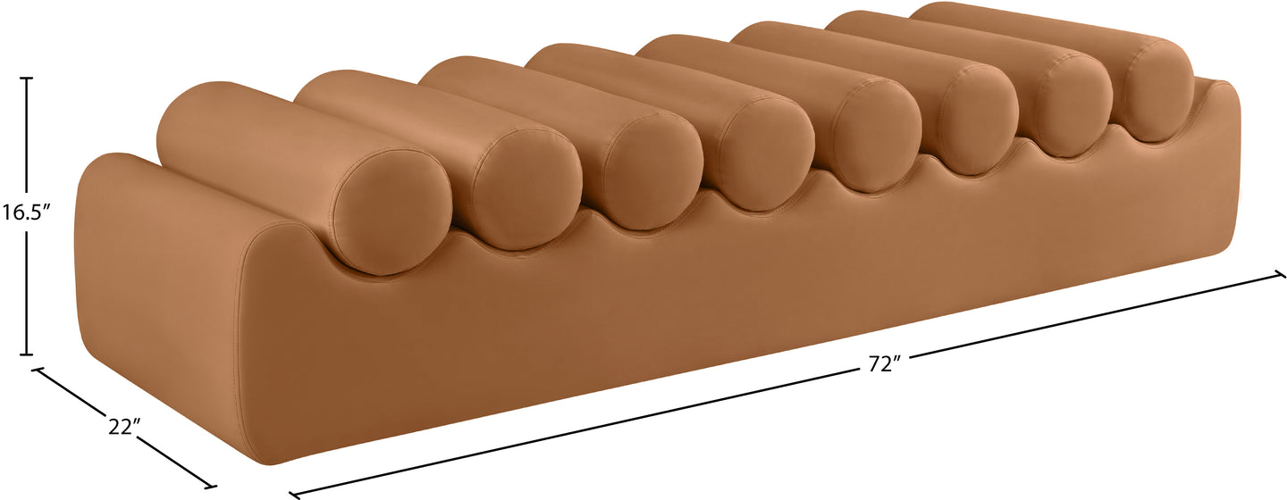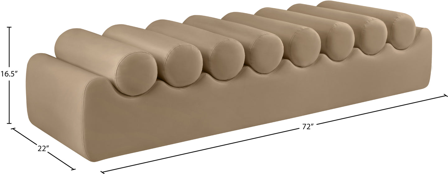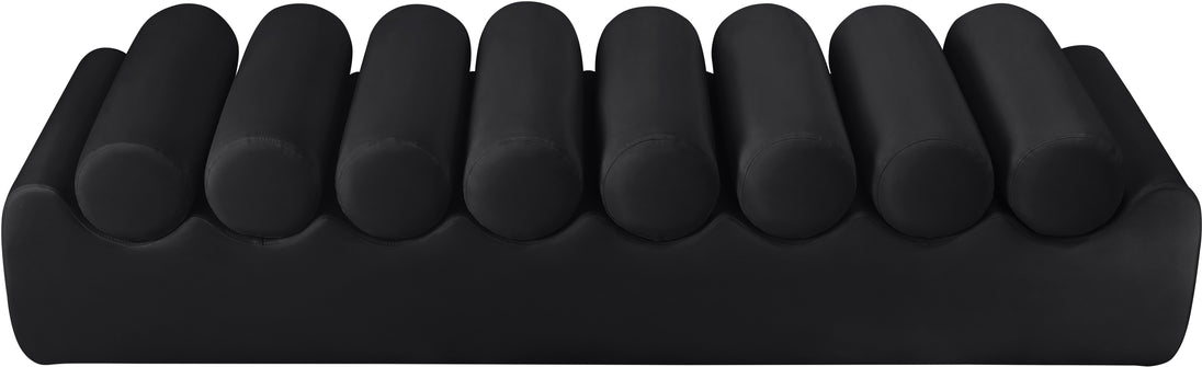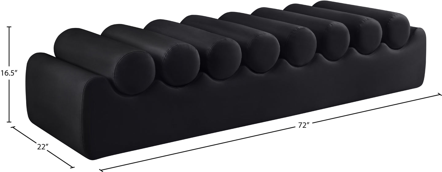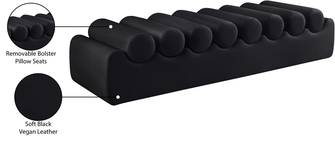 Designed to make a statement, the Rumble black vegan leather upholstered bench features bold cylindrical cushioning that offers both visual intrigue and comfort. Wrapped in sleek vegan leather adds a modern, polished feel, while the unique roll-like seating gives this bench a distinctive look. Perfect for contemporary spaces, the bench is as functional as it is stylish, providing an unexpected yet sophisticated seating option for living rooms, bedrooms, or entryways.