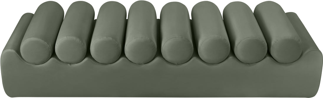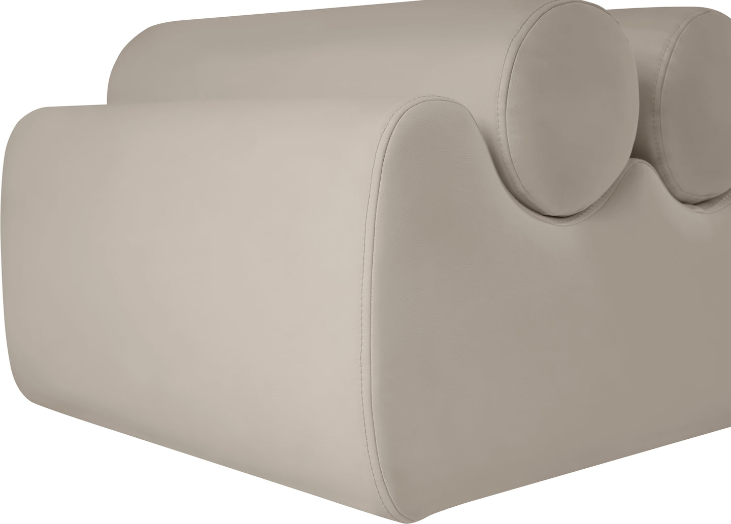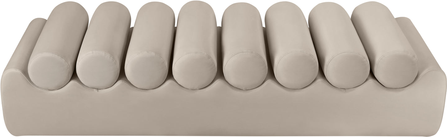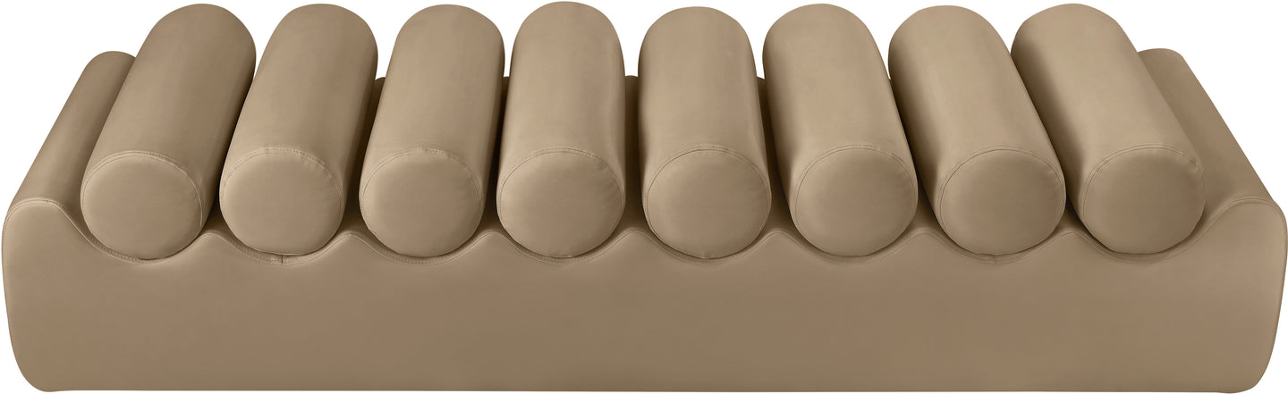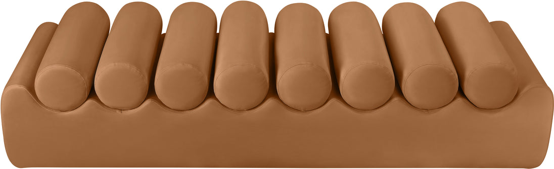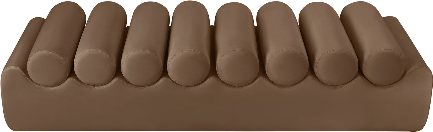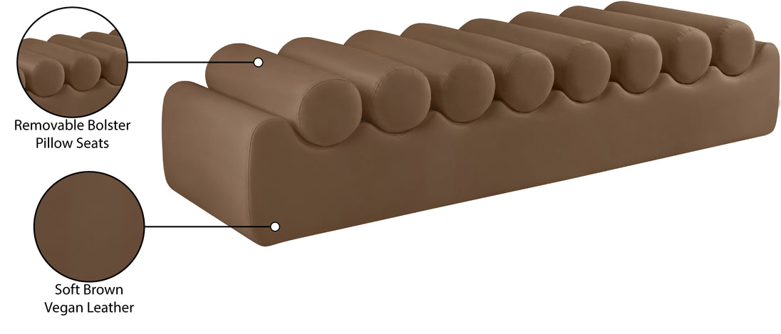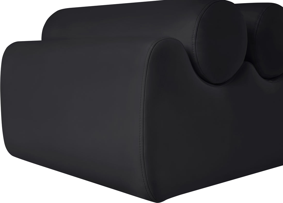 Designed to make a statement, the Rumble black vegan leather upholstered bench features bold cylindrical cushioning that offers both visual intrigue and comfort. Wrapped in sleek vegan leather adds a modern, polished feel, while the unique roll-like seating gives this bench a distinctive look. Perfect for contemporary spaces, the bench is as functional as it is stylish, providing an unexpected yet sophisticated seating option for living rooms, bedrooms, or entryways.