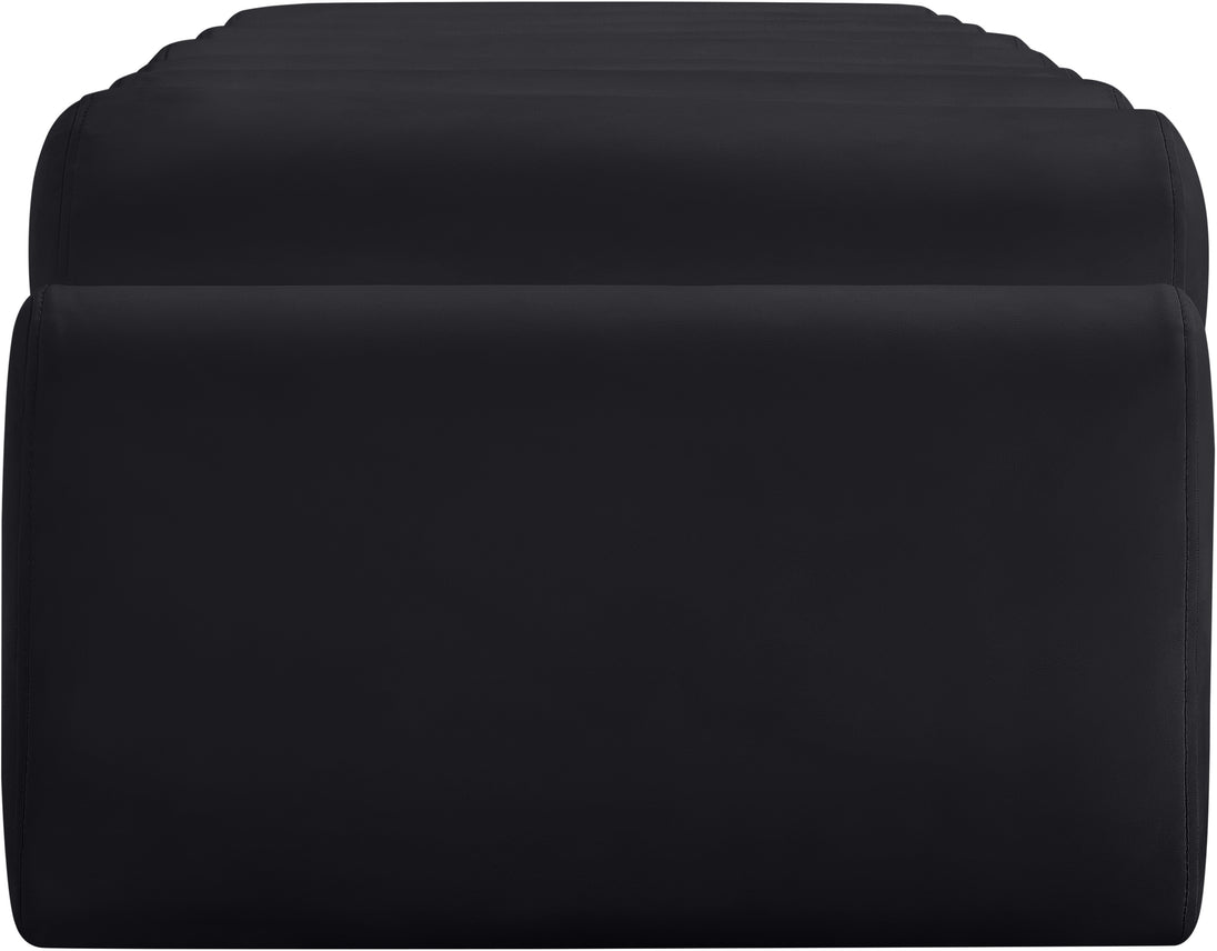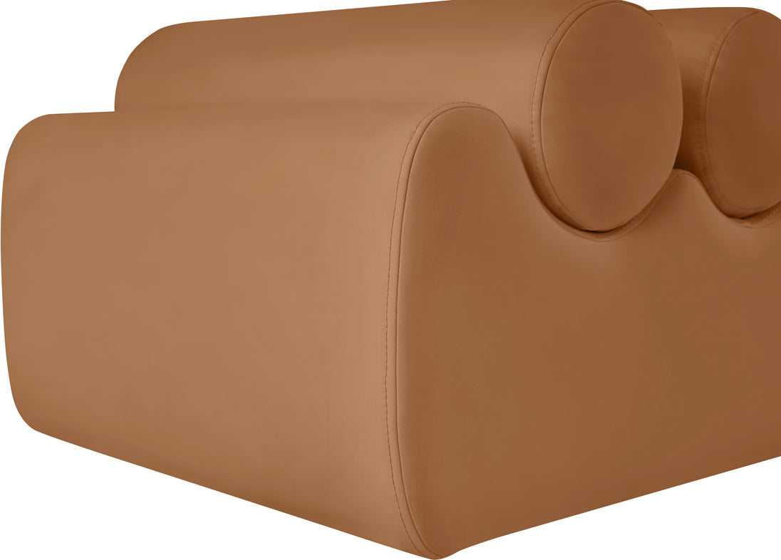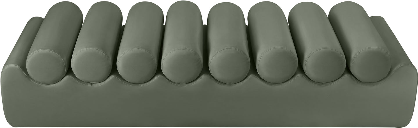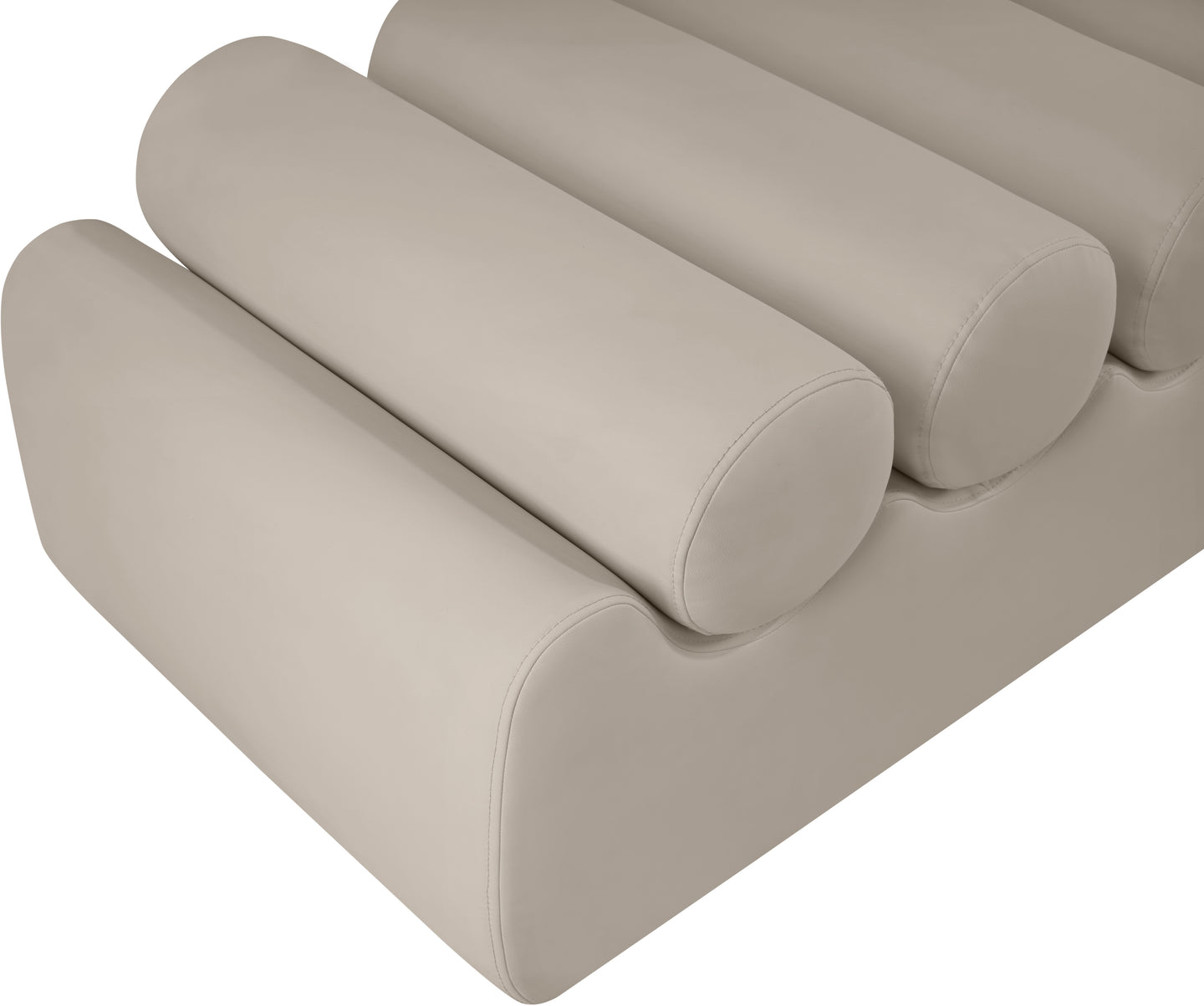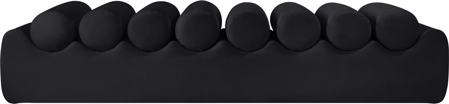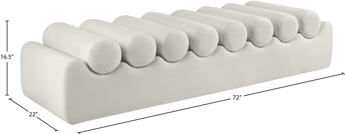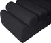 Designed to make a statement, the Rumble black vegan leather upholstered bench features bold cylindrical cushioning that offers both visual intrigue and comfort. Wrapped in sleek vegan leather adds a modern, polished feel, while the unique roll-like seating gives this bench a distinctive look. Perfect for contemporary spaces, the bench is as functional as it is stylish, providing an unexpected yet sophisticated seating option for living rooms, bedrooms, or entryways.