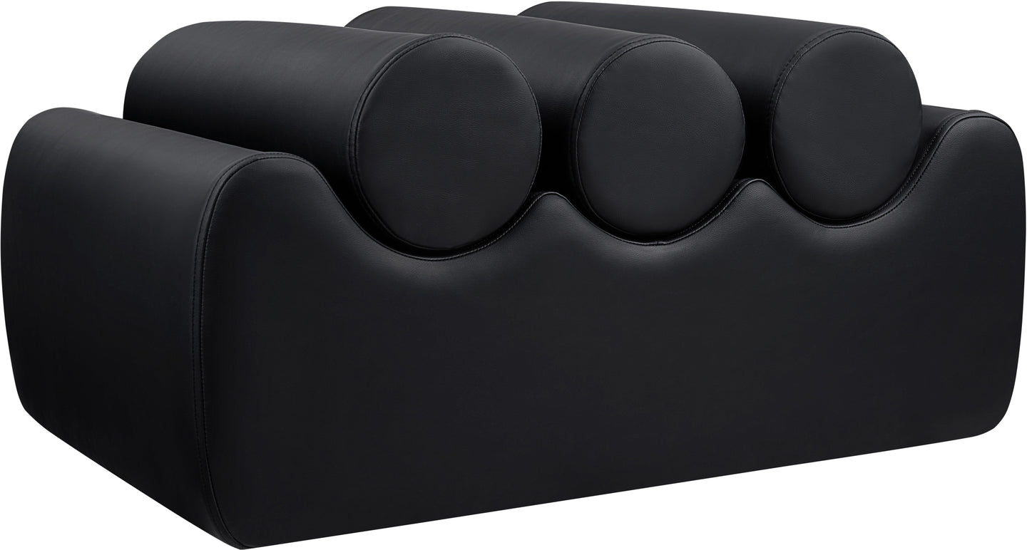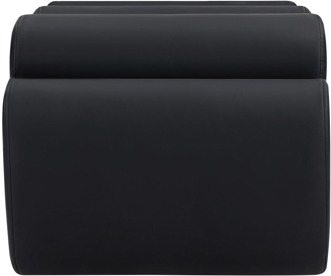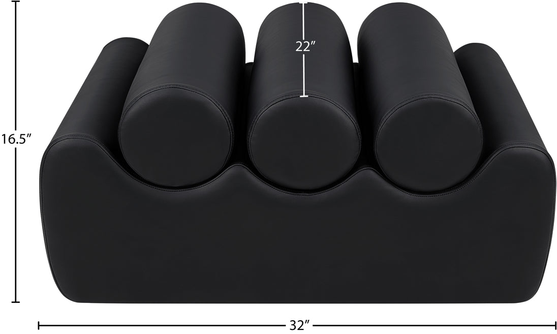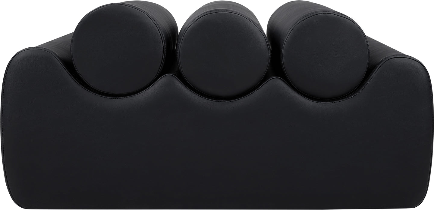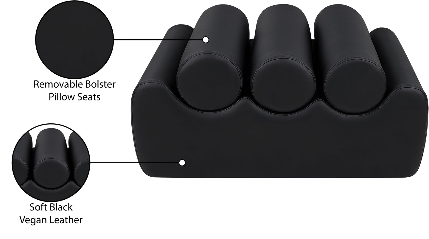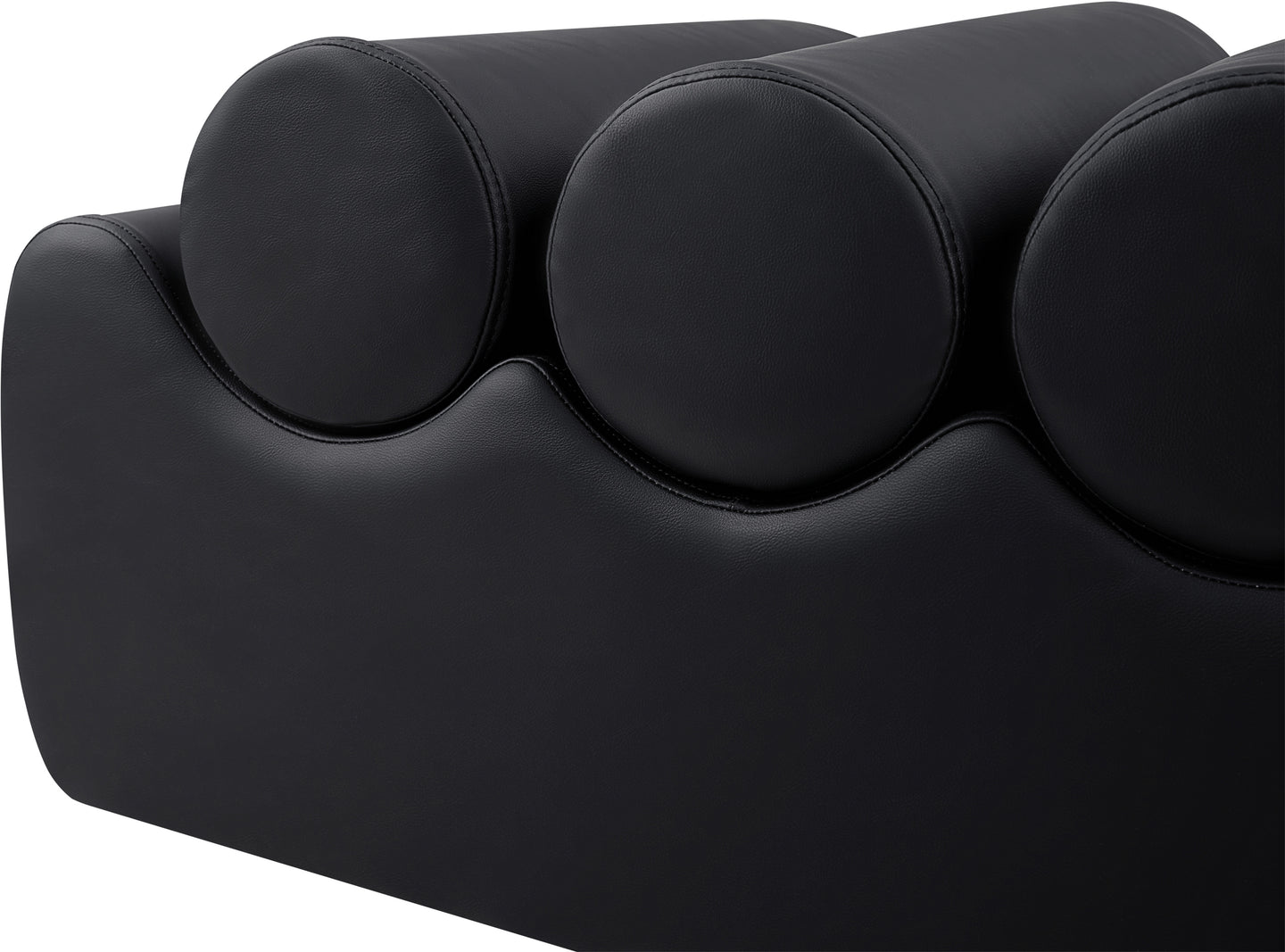Discover the Rumble black vegan leather bench, featuring a sleek, soft feel that adds a touch of contemporary elegance to any room. This stylish bench offers three removable bolster pillow seats for enhanced comfort and versatility. Its modern design seamlessly blends with various decor styles, making it a versatile choice for your entryway, living room, or bedroom.