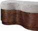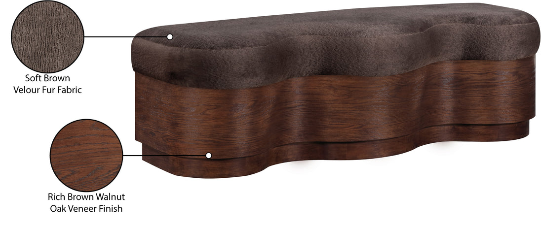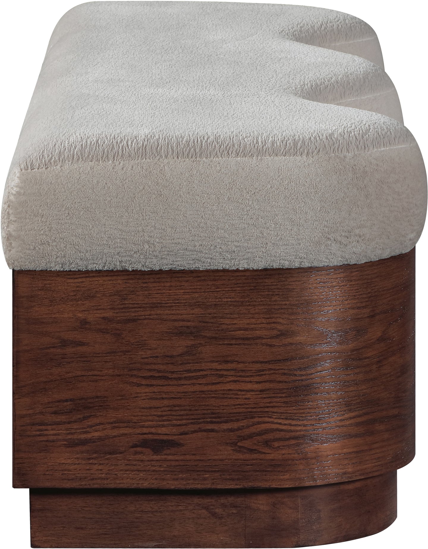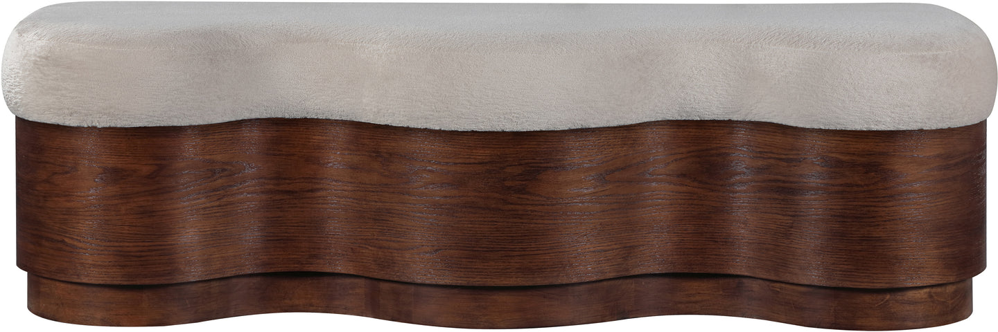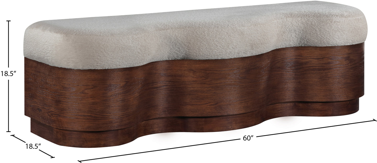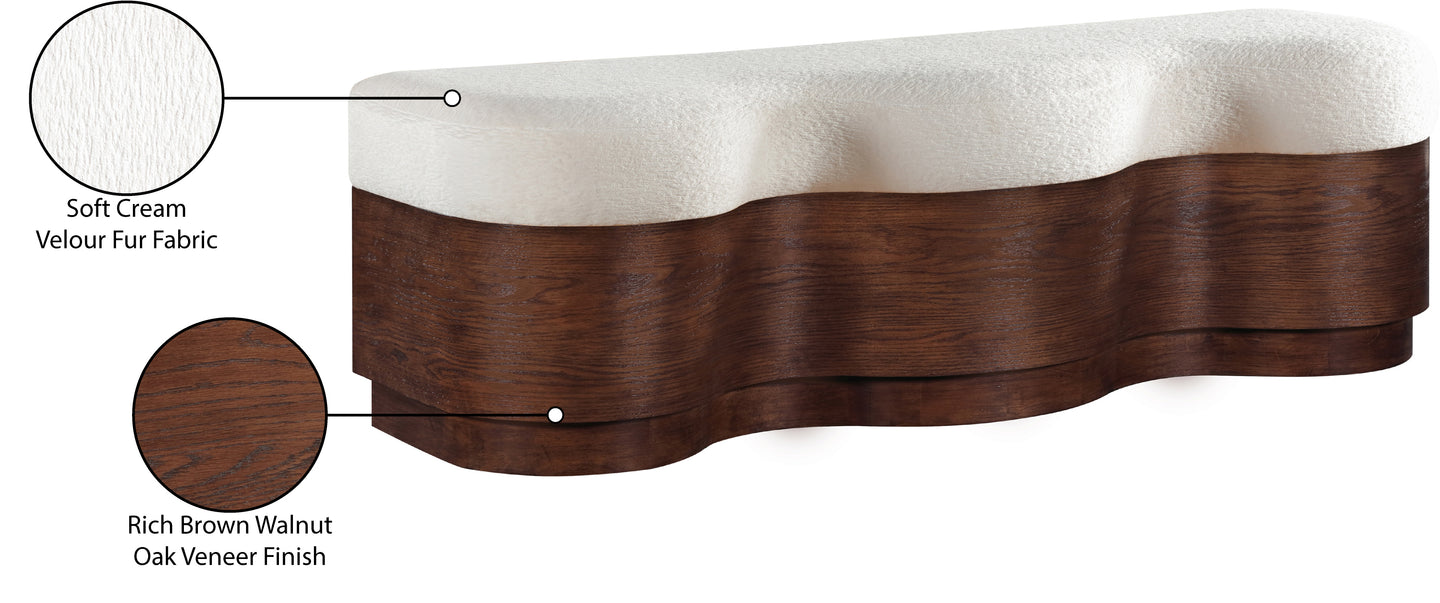 The bold and artistic Savoy beige velour fur fabric upholstered bench brings a unique wave-like design to your space. Plush velour fur fabric atop creates a soft, luxurious seating experience, while the sculptural wooden base in a rich brown walnut finish adds a playful yet sophisticated touch. Perfect for those seeking to make a statement, it blends form and function, offering comfort and style in one eye-catching piece.