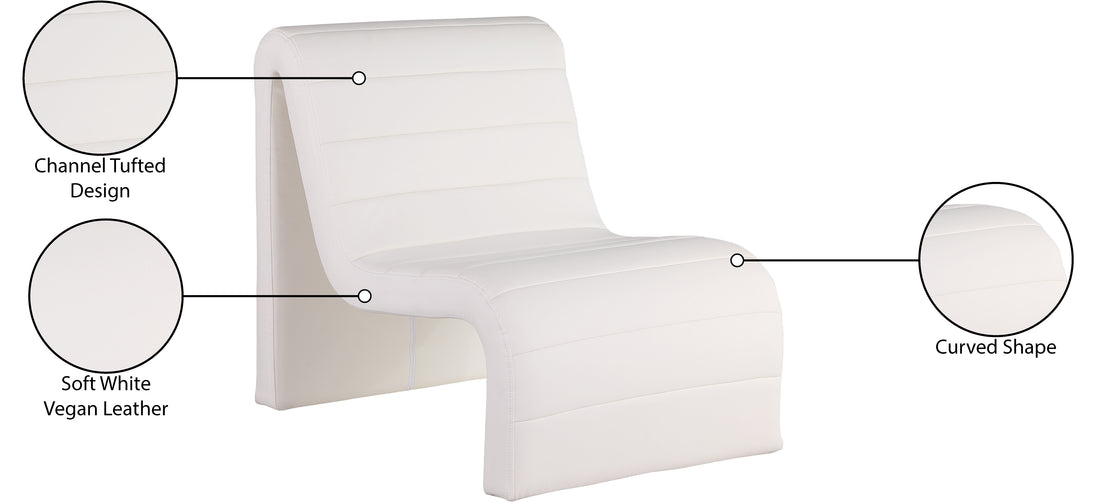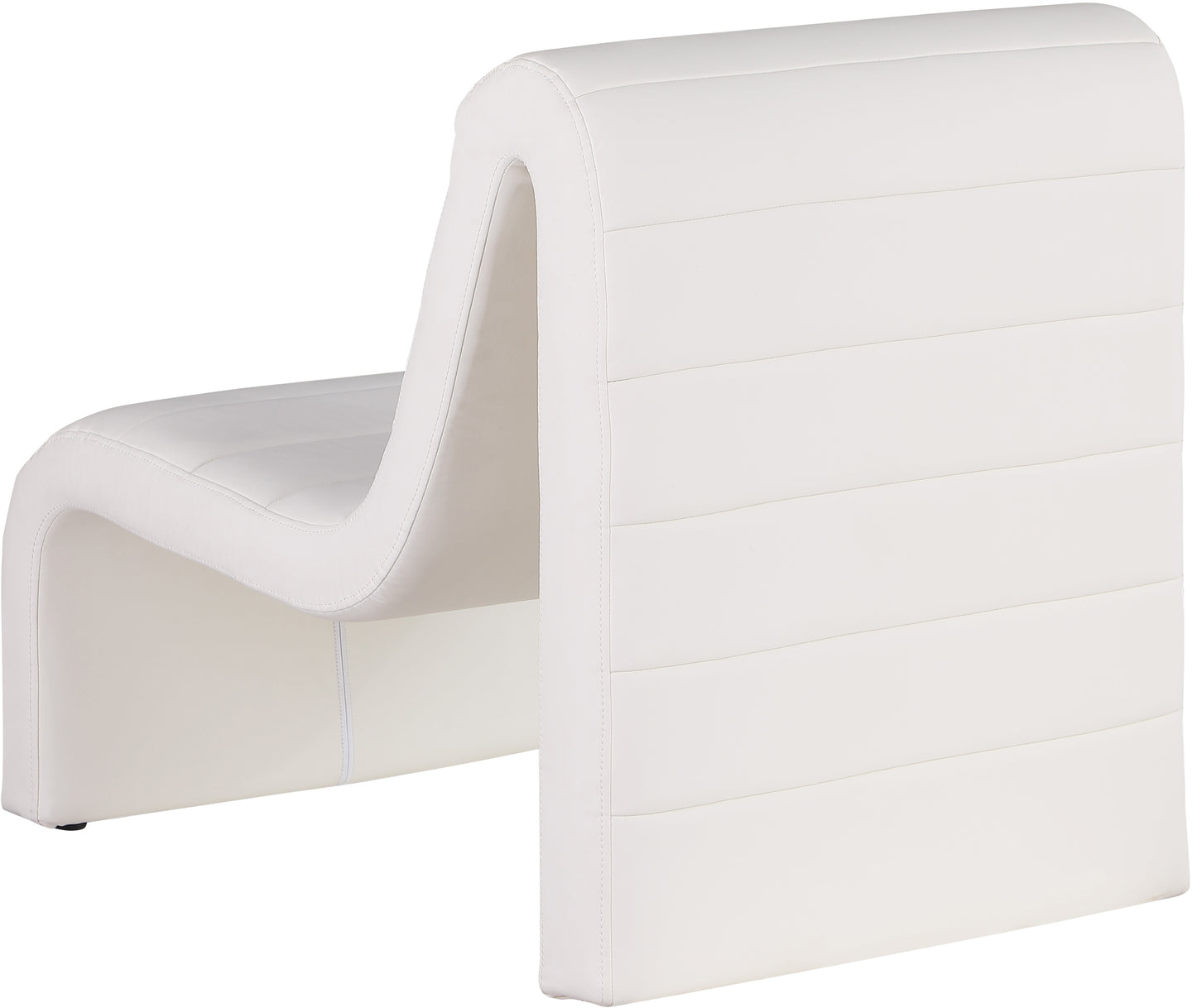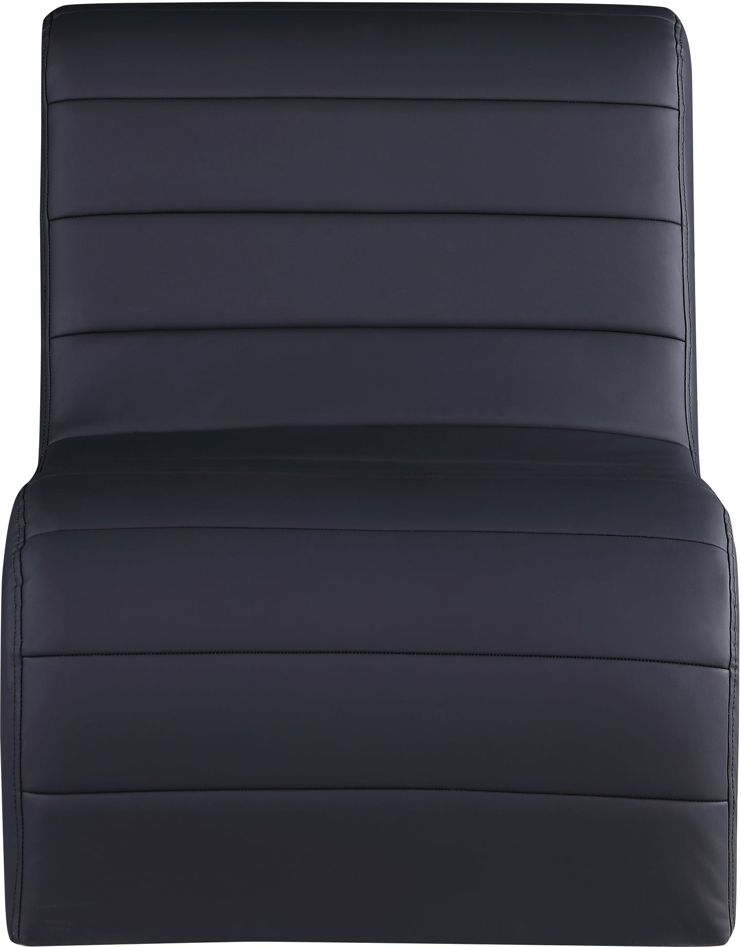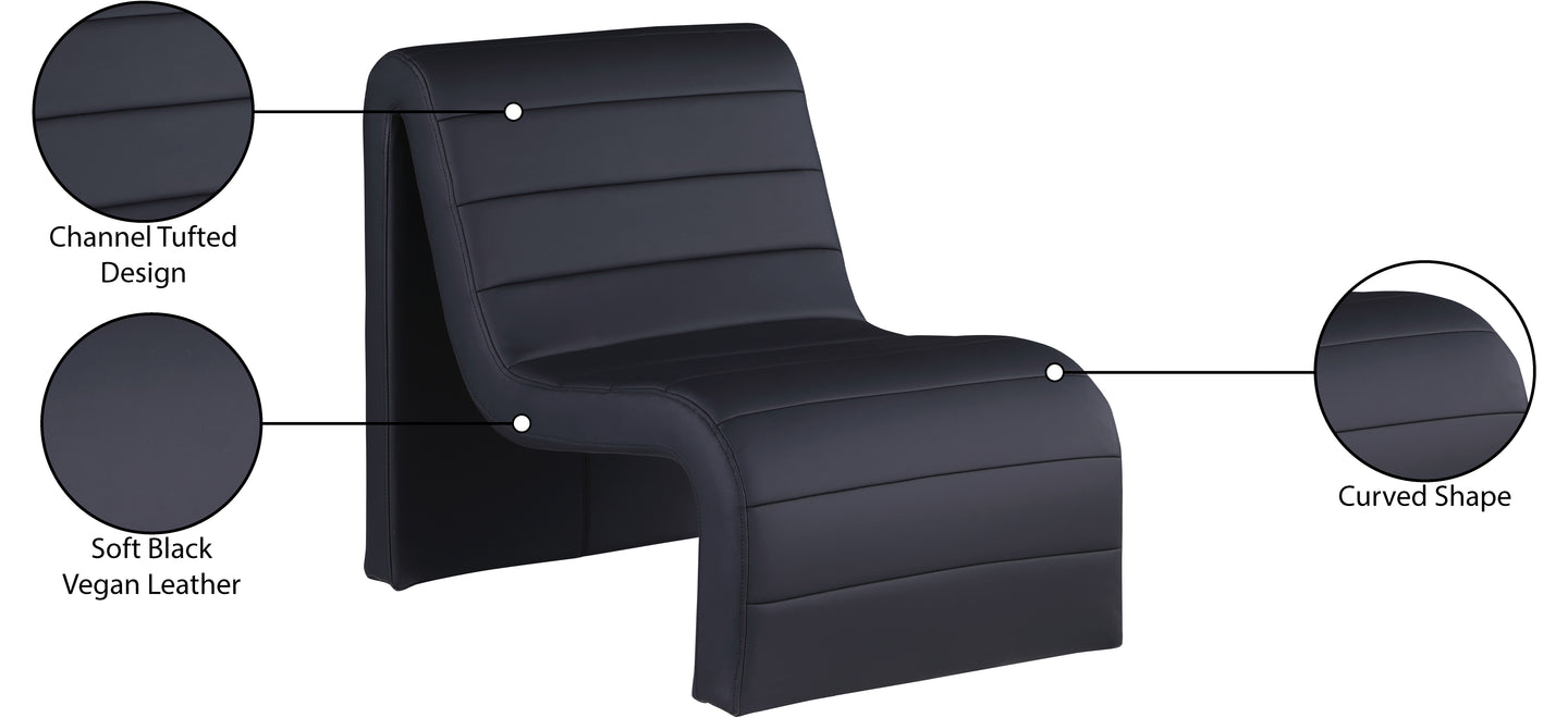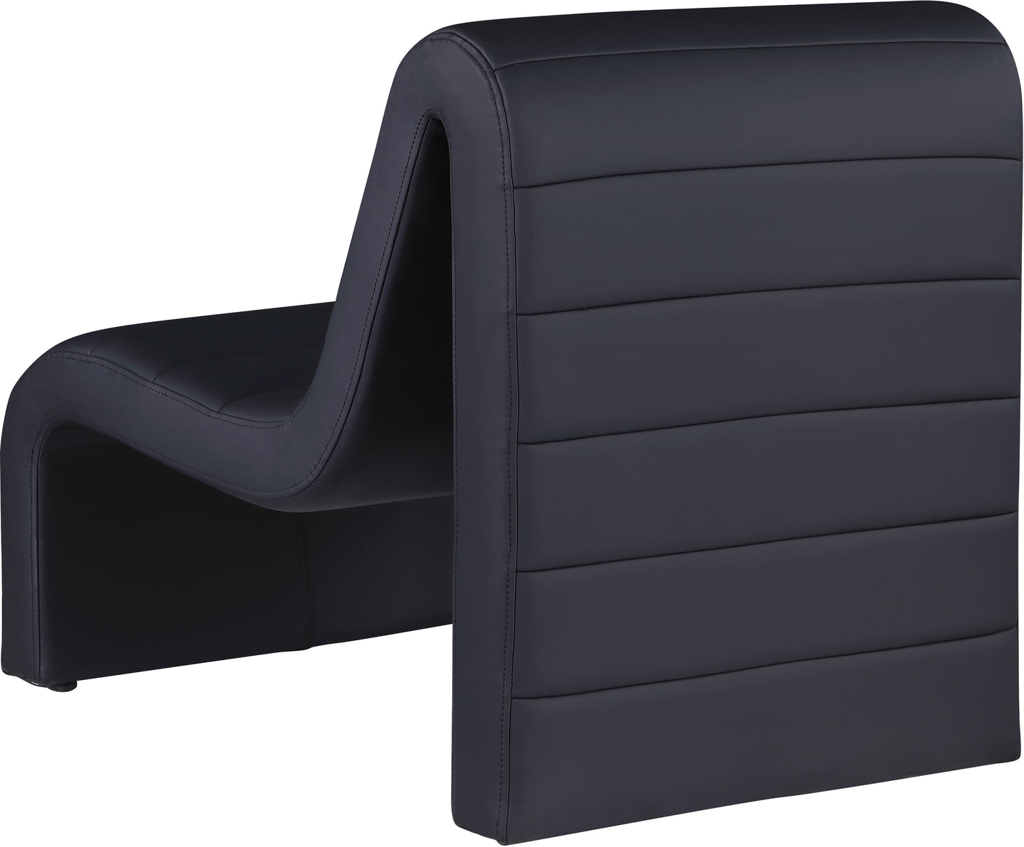 Count on this Ivy black vegan leather accent chair quickly becoming the most coveted seat in the house. Wrapped in soft vegan leather and adorned with a channel tufted design, its curved shape offers unparalleled comfort and support. Designed for the modern home, it effortlessly blends contemporary aesthetics with luxurious materials. Whether placed in a cozy corner or as a standout piece in your living room, this chair invites you to unwind in unparalleled elegance and enjoy a moment of tranquil indulgence.