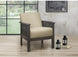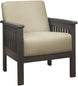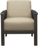 Product Description: Designed with inspiration from the Arts and Crafts movement, the Lewiston Collection will be a classic addition to your home's decor. The chair's transitionally styled legs and vertical slat-supported wood arms are finished in an antique gray, providing complementing contrast to the brown linen-like fabric covering.
