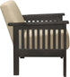 Specifications: Solid rubberwood frame. Foam padding over pocket coils. Textured fabric upholstery. Attached back and seat cushions. Exposed wood frame with antique gray finish. Assembly required. Weight capacity: 300lbs. Fabric Type: Textured. Fabric Color: Light brown. Fabric Content: 100 percent polyester. Fabric Cleaning Code: Upholstery (S). Prop 65 Information.