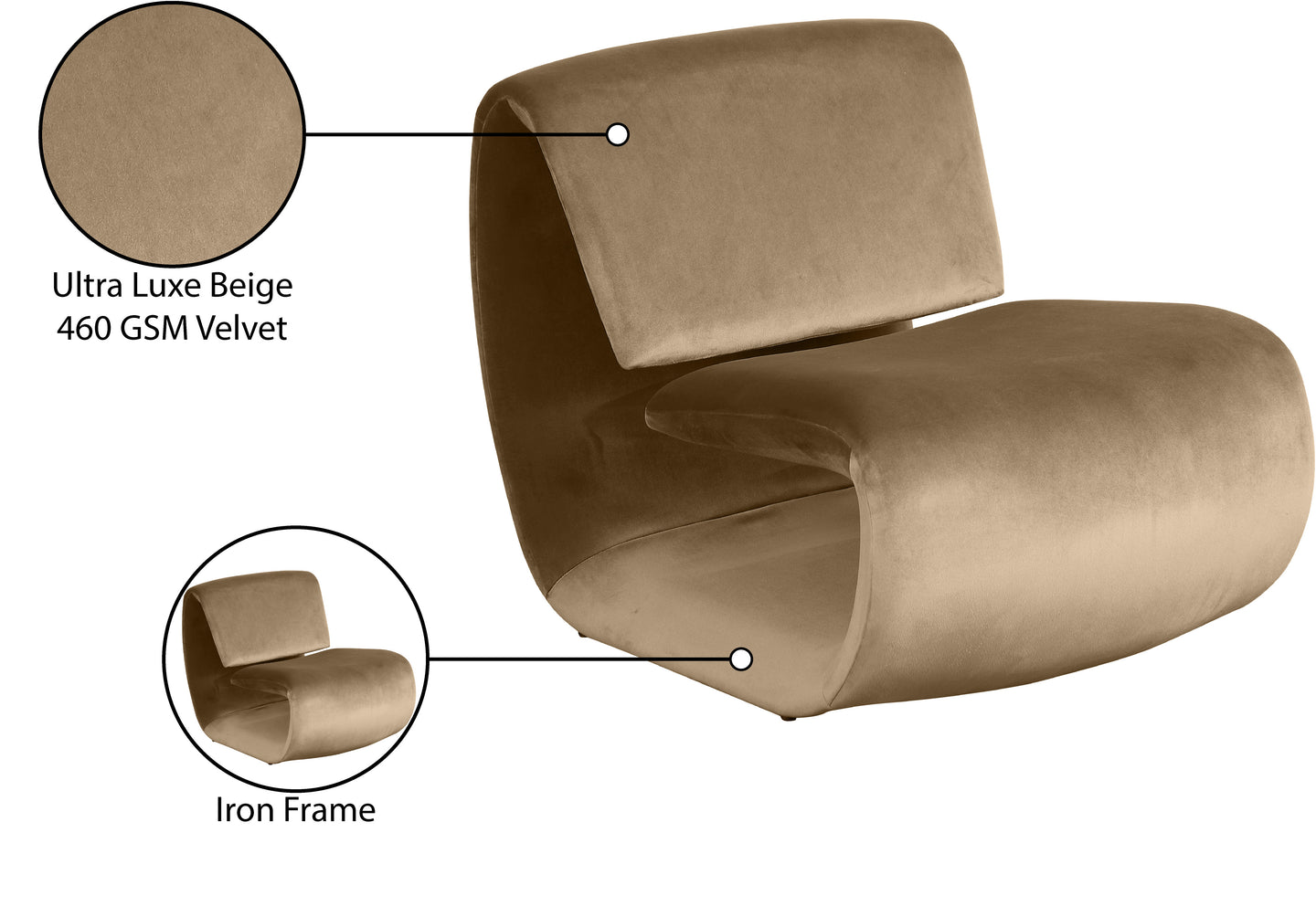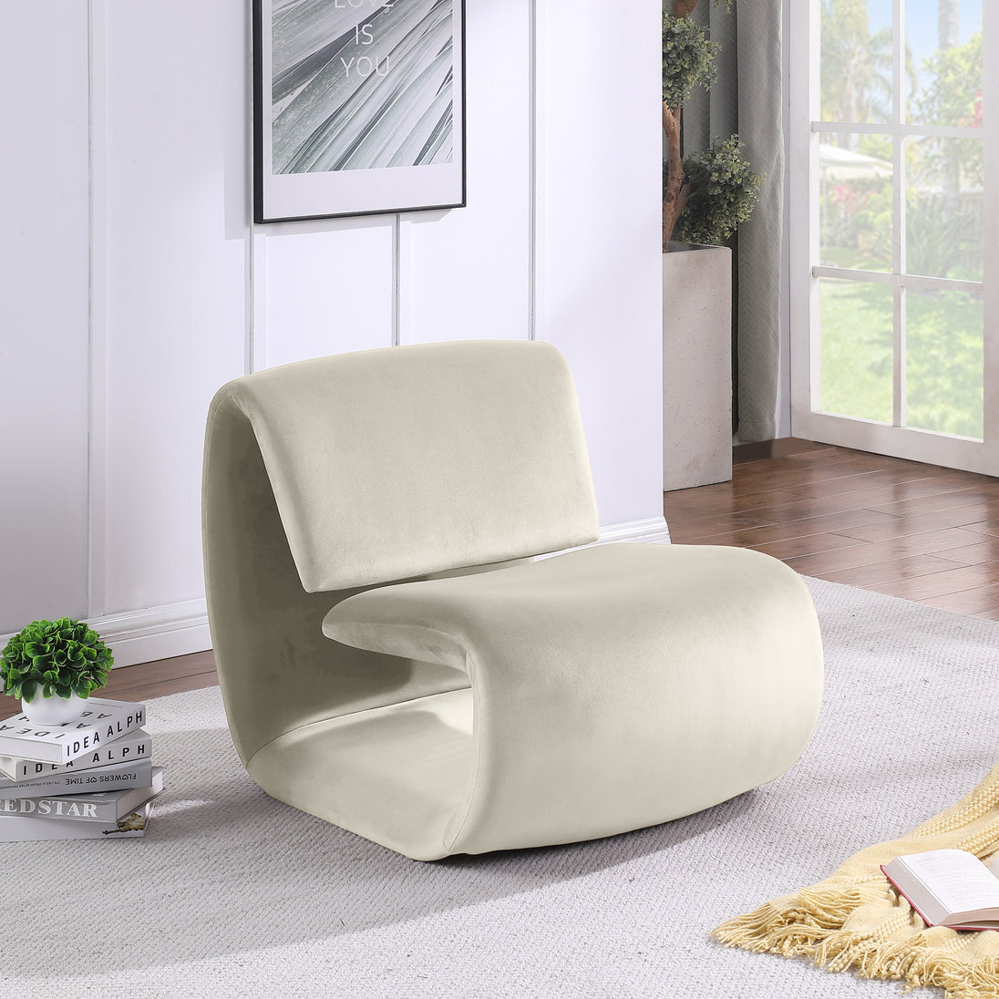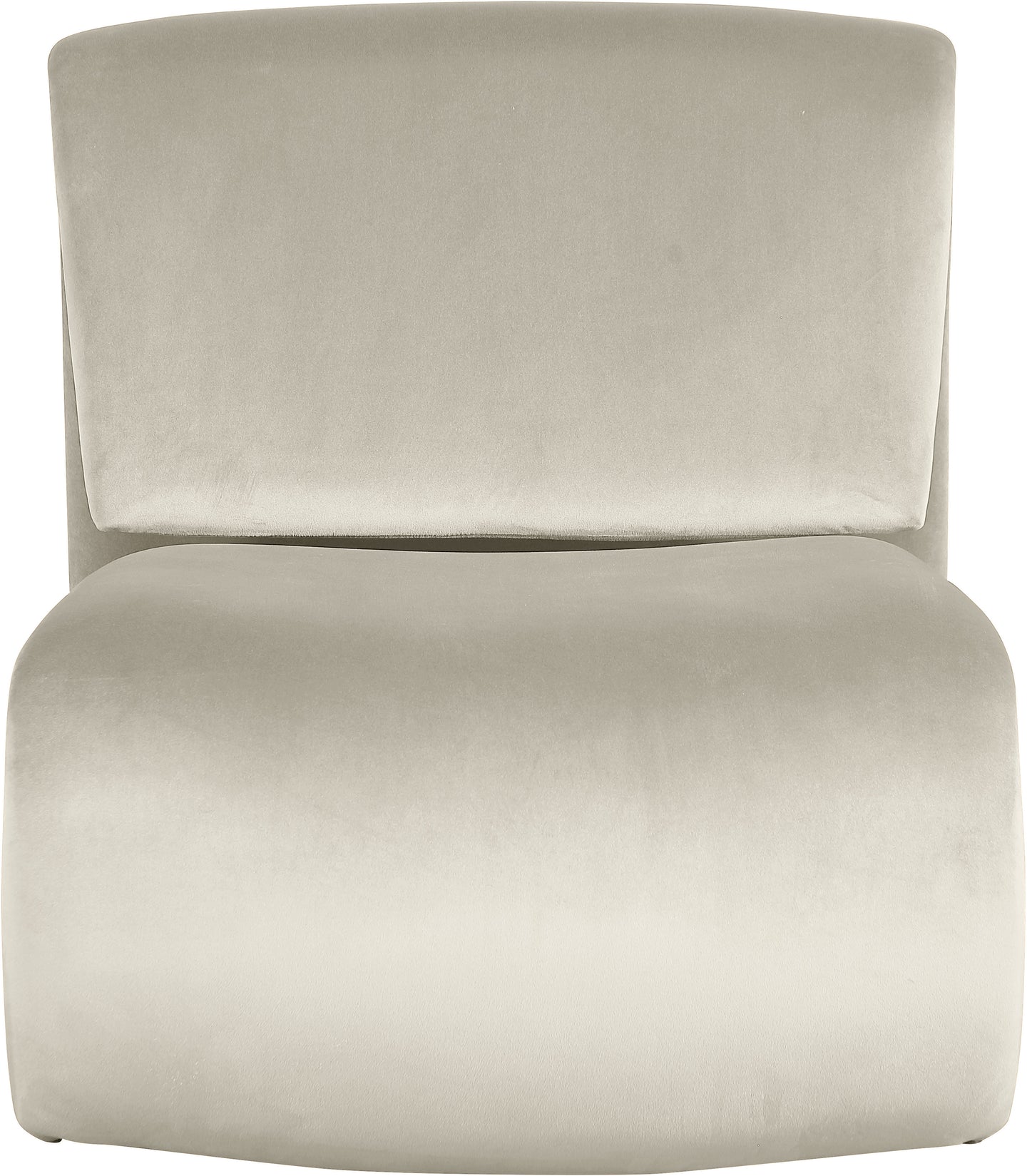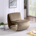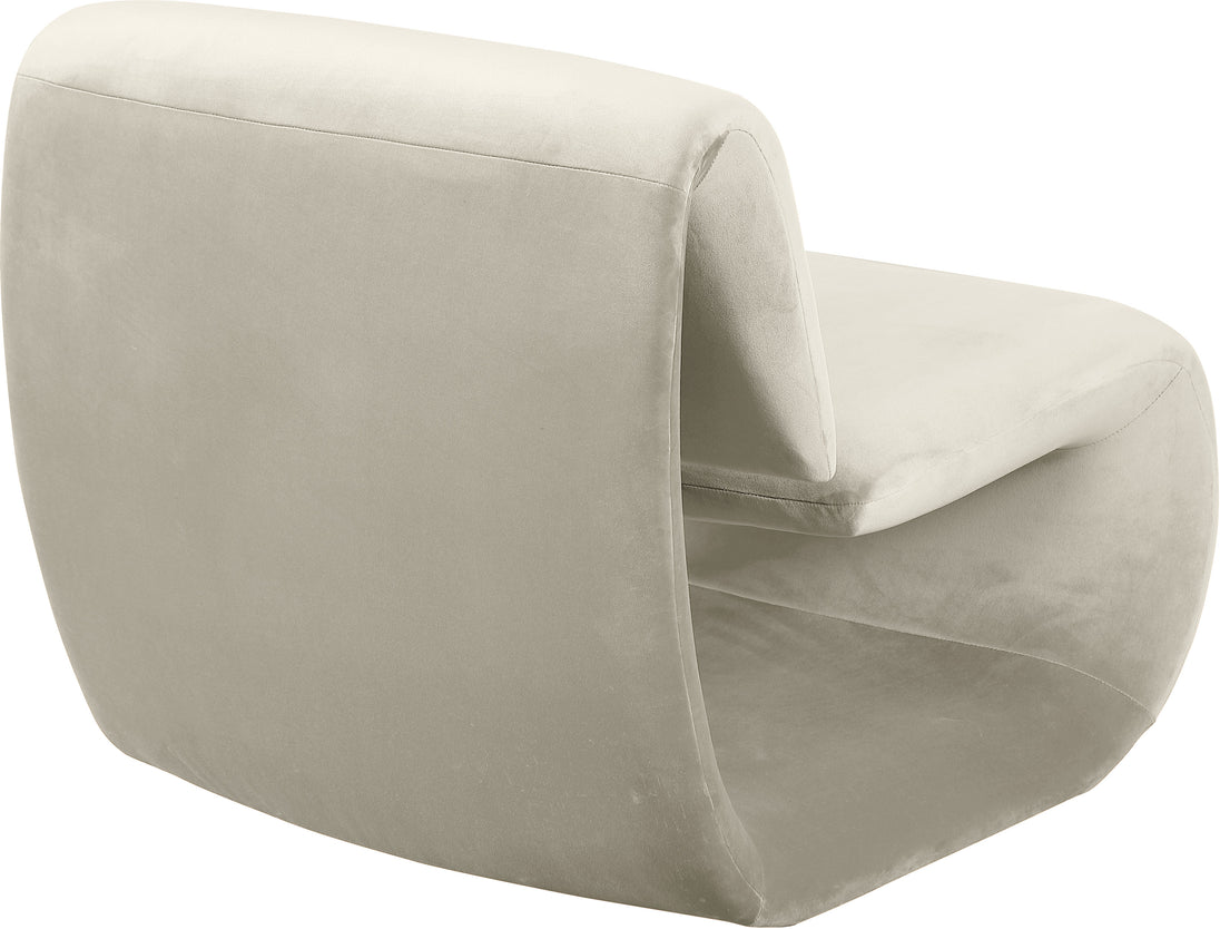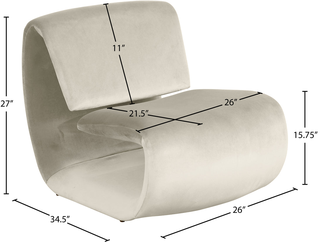 The playful Nouveau beige velvet accent chair is a unique piece that will spark conversation. Its innovative design and soft velvet upholstery make it a comfortable and eye-catching addition to any room. Embrace the future of seating with its sleek, sculptural design to create a futuristic and chic aesthetic.