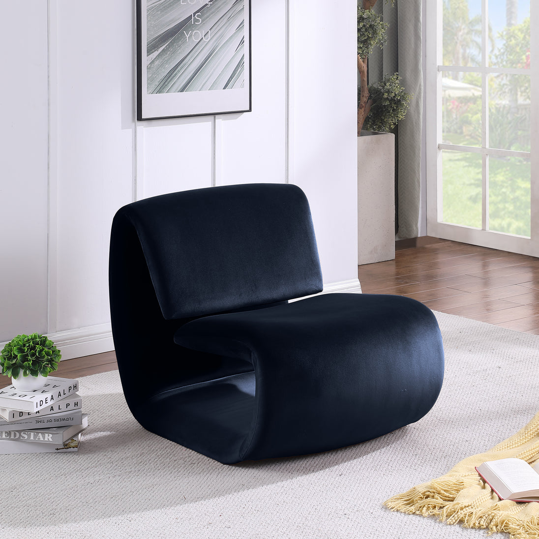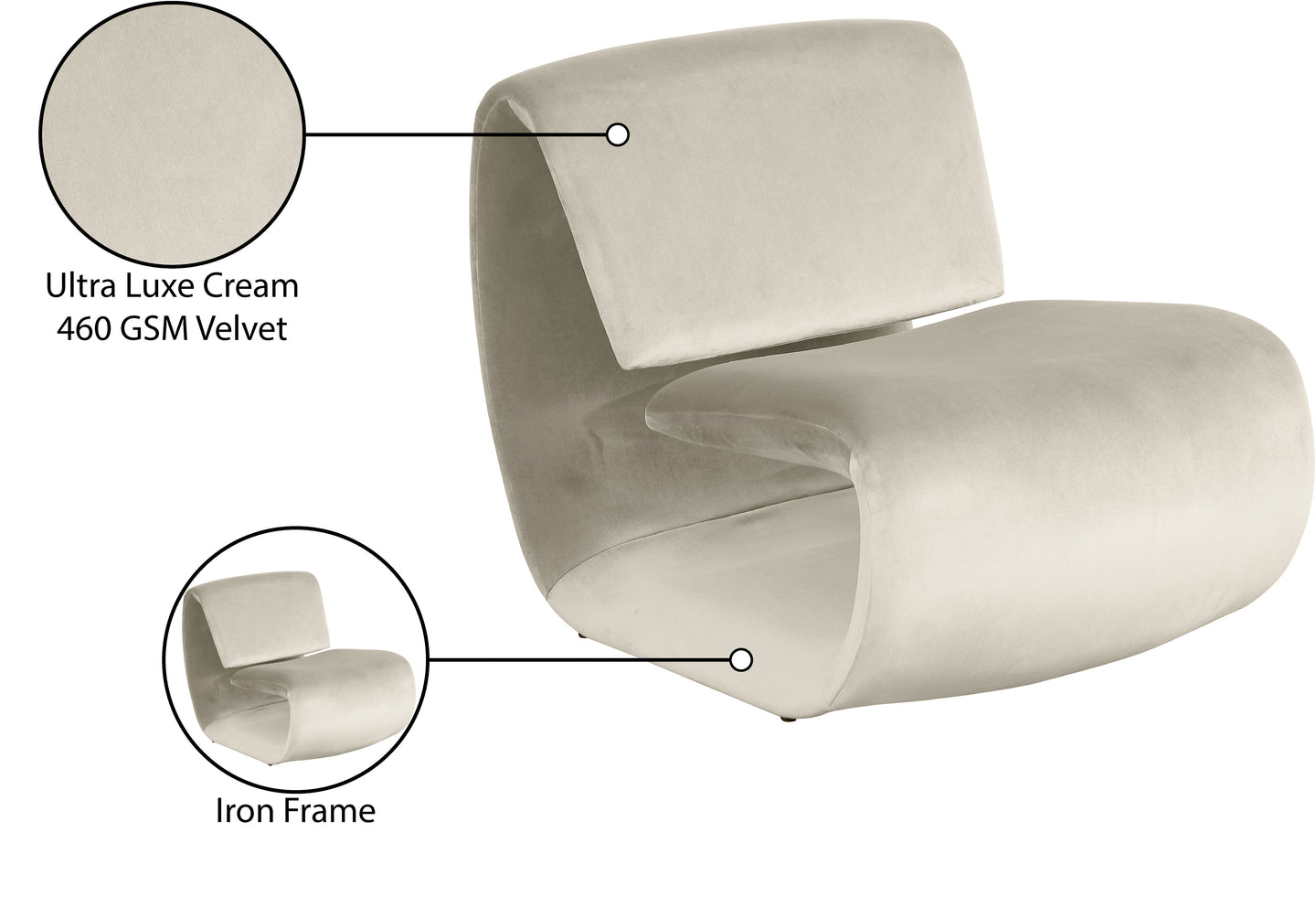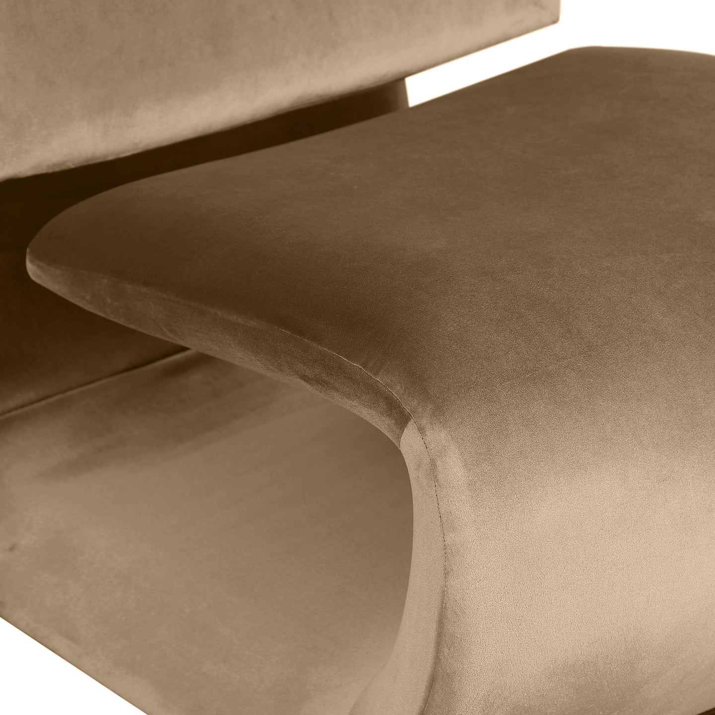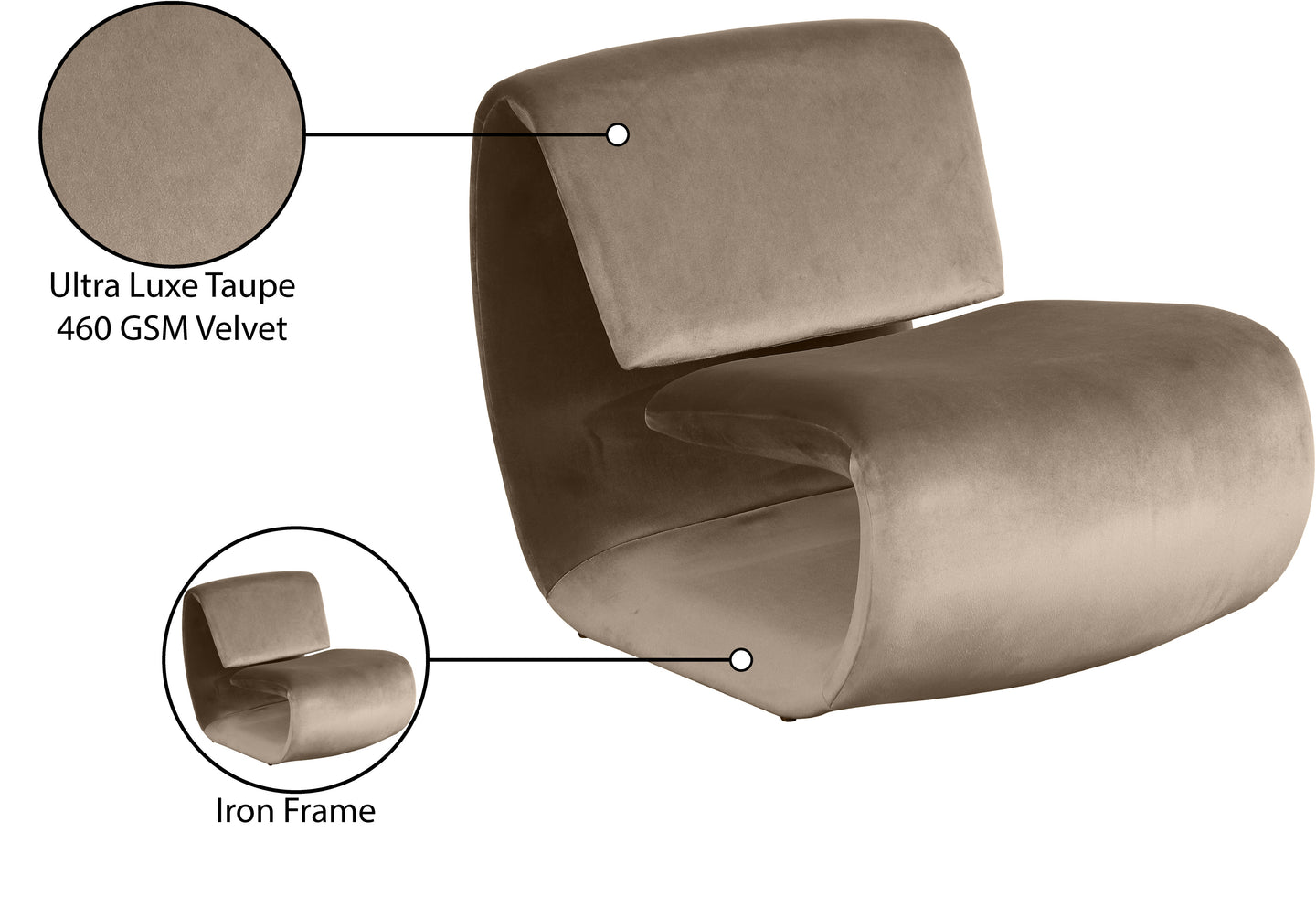 The playful Nouveau beige velvet accent chair is a unique piece that will spark conversation. Its innovative design and soft velvet upholstery make it a comfortable and eye-catching addition to any room. Embrace the future of seating with its sleek, sculptural design to create a futuristic and chic aesthetic.