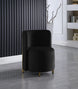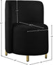 Create an envious look in your living room, parlor, bedroom or boudoir with this Rotunda velvet chair. This svelte little chair features a glamourous Hollywood vibe with its floor-length back and barrel design. The soft black velvet upholstery lends it an added upscale feel, and the gold metal legs round out its contemporary panache. A wooden frame makes the chair a sturdy addition to any room.