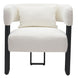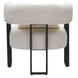 Modern bucket-style accent is the epitome of high-end designer style. The textured boucle fabric and the squared, black metal frame work perfectly with the contoured seat back to create the perfect accent seating. Matching throw pillow provides lumbar support or gives opportunity for mixing and matching with other fabrics in the room. Create a cozy conversation space in a formal living room, or place in a bedroom for a perfect reading chair.