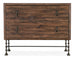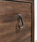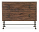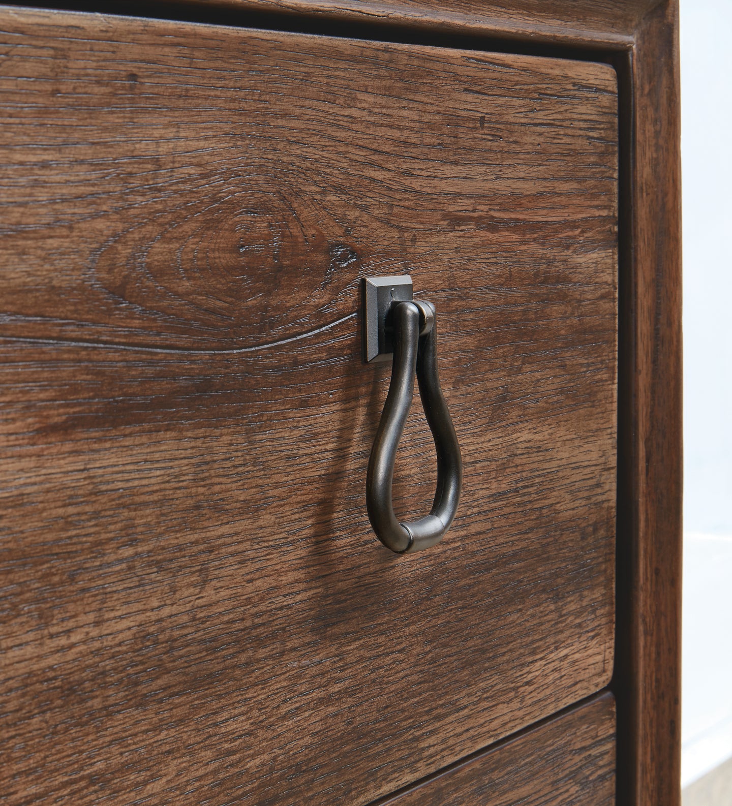 - Finish: Timber: a darker warm, rustic, organic finish over hickory veneers. Distressing includes chopping, rock, drawknife, gauging, chain distressing and wire brush. Dark brushed bronze drop bail pulls and metal legs.