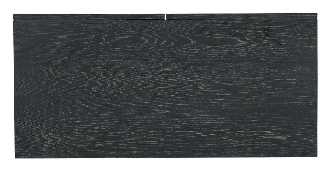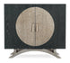 Organic with a touch of glam, the Nolita Two-Door Cabinet is crafted of Oak Veneers, resin and metal and combines a charcoal finish with a medallion-like insert, metal teardrop pulls and a base in a pewter finish, along with a contrasting brown stained interior. The two doors have soft-close hinges. The interior is painted gray, and there’s one adjustable shelf and a ventilated back panel.