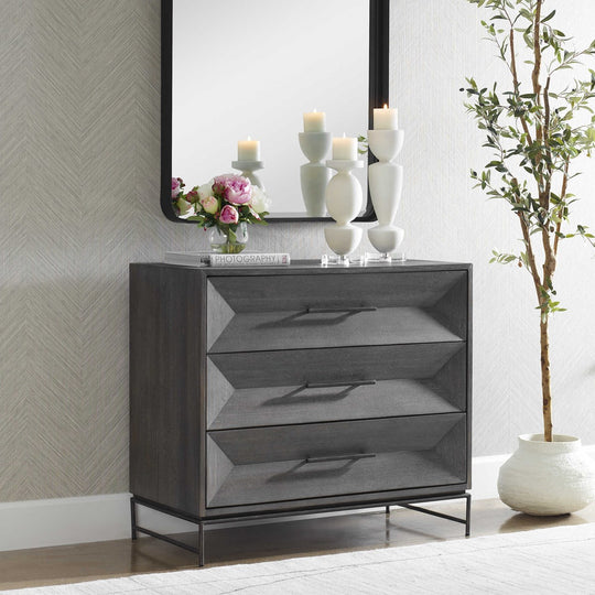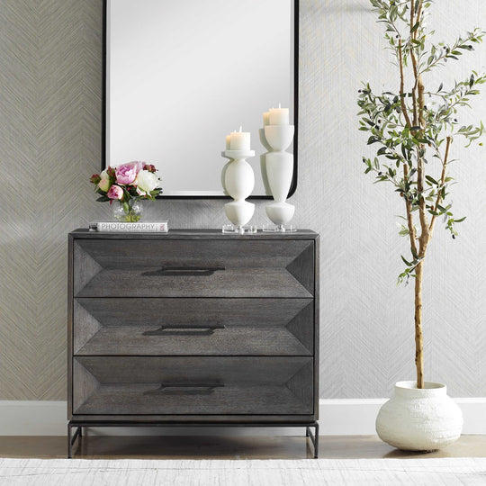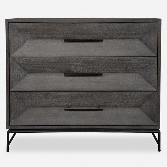 Displaying balanced elegance through its three symmetric drawers this chest is crafted from rich acacia veneer in dark walnut stain washed with a light gray glaze. Beautifully accented by sturdy aged iron legs and matching hardware...Sale price $1,399.00Regular price $1,899.00Sale price $1,399.00Regular price $1,899.00 -