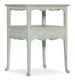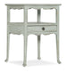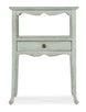 Capturing the vintage charm of the coastal South, this delightful accent table is crafted of Maple Veneers and has scalloped accent trim. The one drawer has self-close drawer guides and a matching-finish interior. The table finish is Haint Blue, a soft color which can be found on the ceilings of porches and entryways, window shutters and doors in the American South, dating back more than 200 years from the Gullah folklore that held the color kept “haints” or spirits from entering homes and dwellings. The table is finished on all sides so it can be floated in a room. The round pull knob is in an antique bronze color.