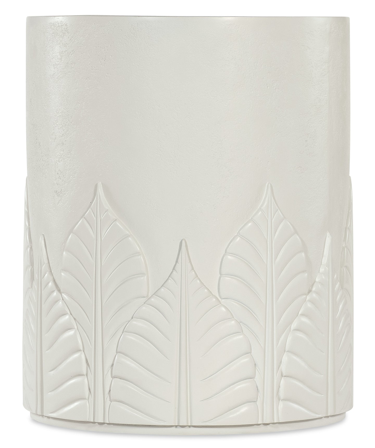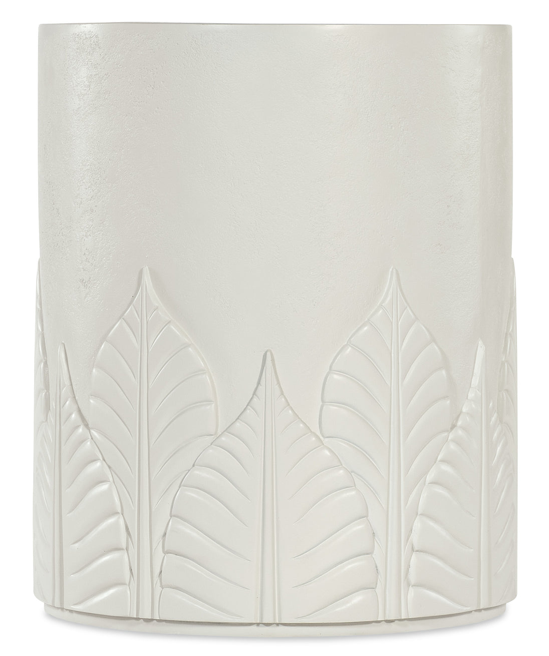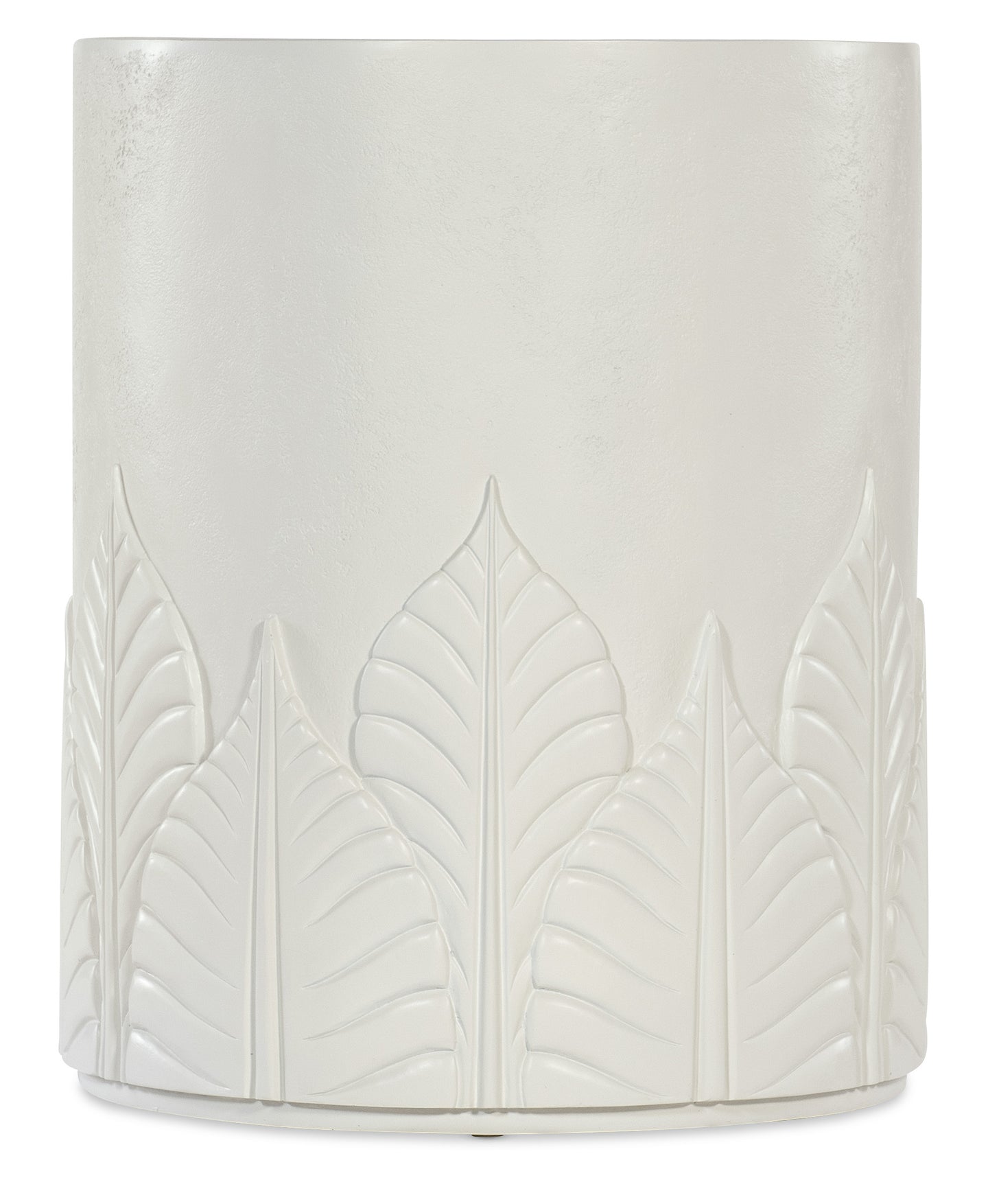 The Amelia Round End Table mirrors the design of the cocktail table with its textured plaster-like finish and embossed leaf motif. Crafted from wood and resin, it features a round shape and durable construction. Its clean, white tones make it a perfect addition to any contemporary or casual space, providing function and style in a smaller footprint.