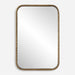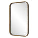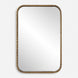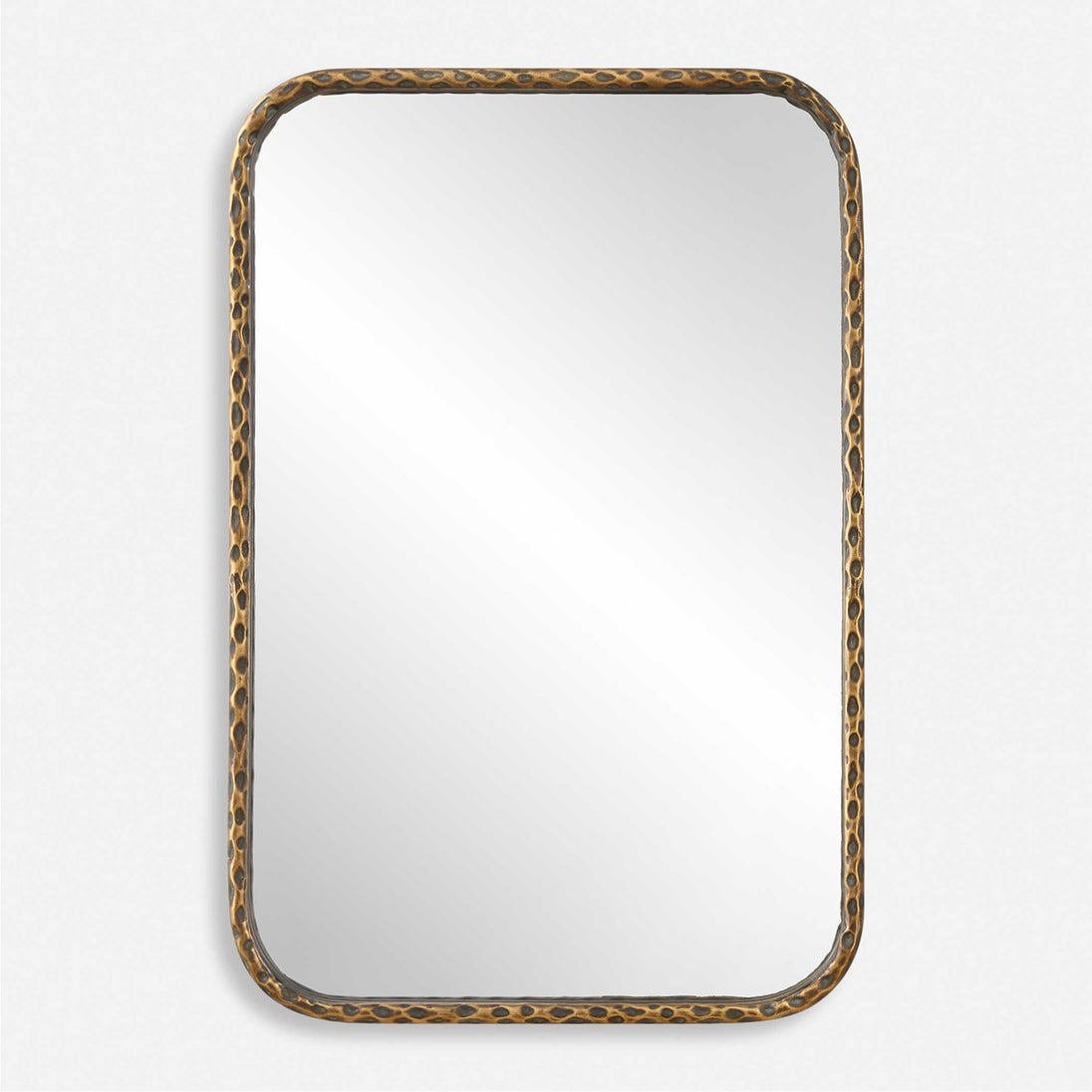 This vanity mirror features a hammered textured iron frame finished in an aged bronze with intricately knotted detailing adding an organic touch to an otherwise simple silhouette. May be hung horizontal or vertical.