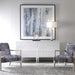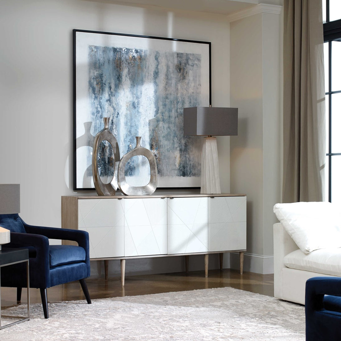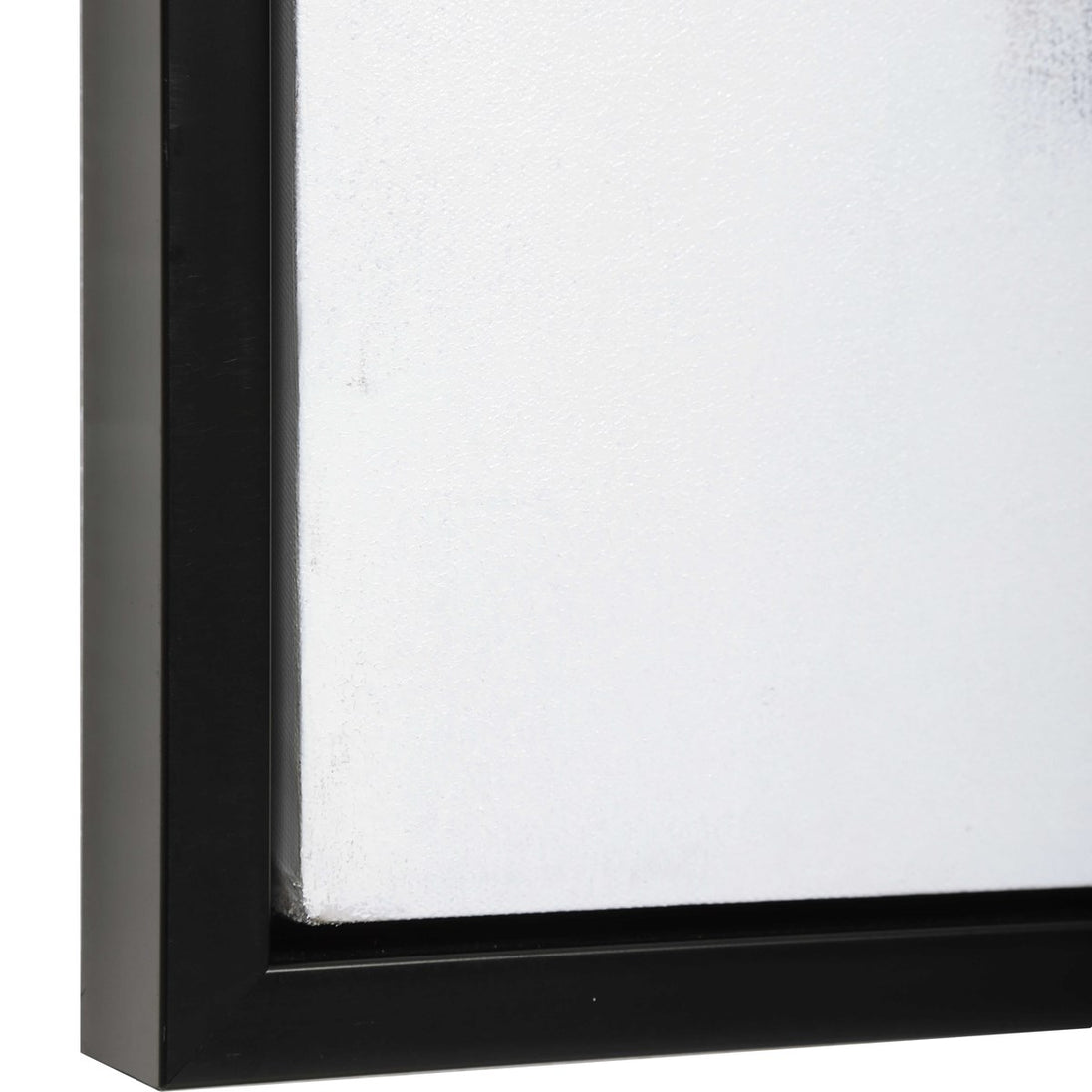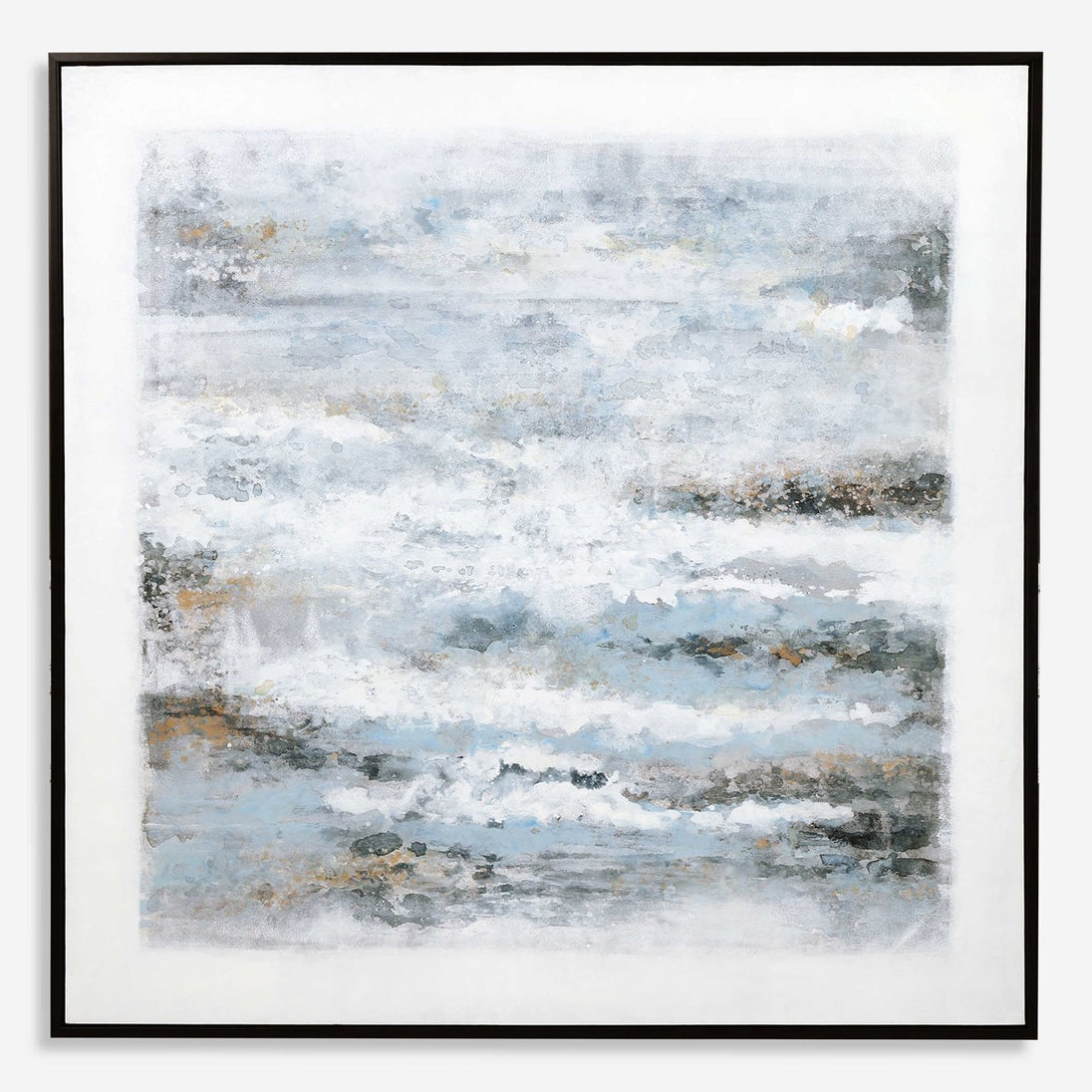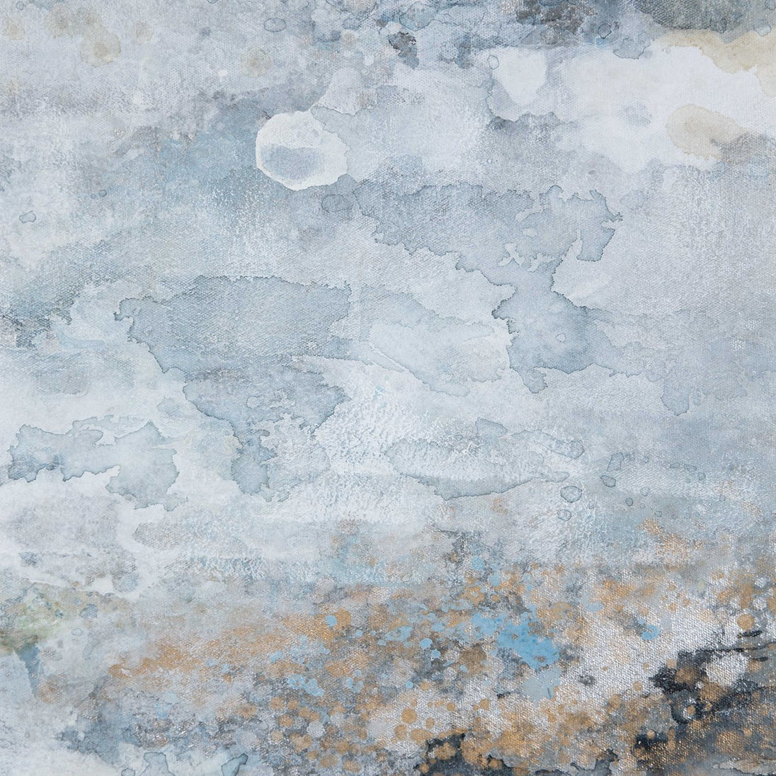 Soft and ethereal, this hand painted artwork evokes a sense of tranquility and ease. Light blue, gray, and white tones are blended and accented by light gold leaf details and a petite matte black gallery frame. Due to the handcrafted nature of this artwork, each piece may have subtle differences. May be hung horizontal or vertical.