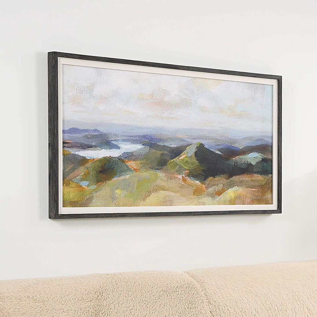 Majestic and tranquil, this landscape artwork showcases a bold array of hues that could be found in nature. Surrounded by a white linen mat and black wood grain frame. Artwork by Danhui Nai.