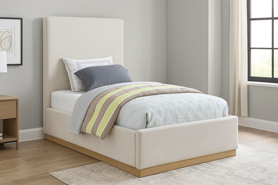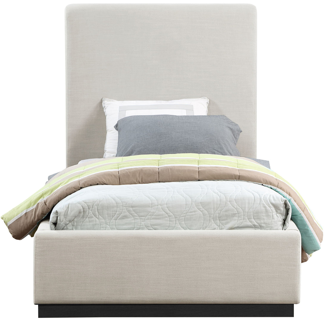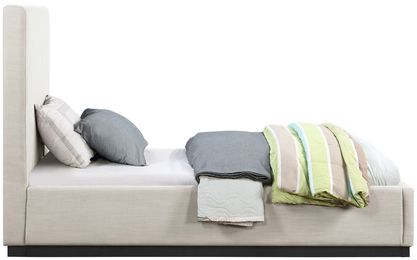 Give your bedroom a regal vibe when you add this Alfie linen textured fabric bed to the mix. The ultra tall headboard on this bed makes a bold impression from all angles and is covered in rich linen textured fabric that forms a pleasant contrast with the black finish solid wood base. The full flat design lets you easily use this bed without a box spring - a top mattress is all that's needed.