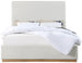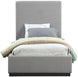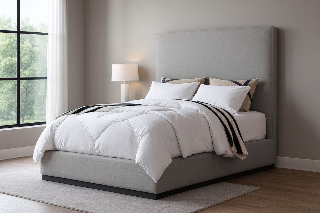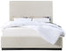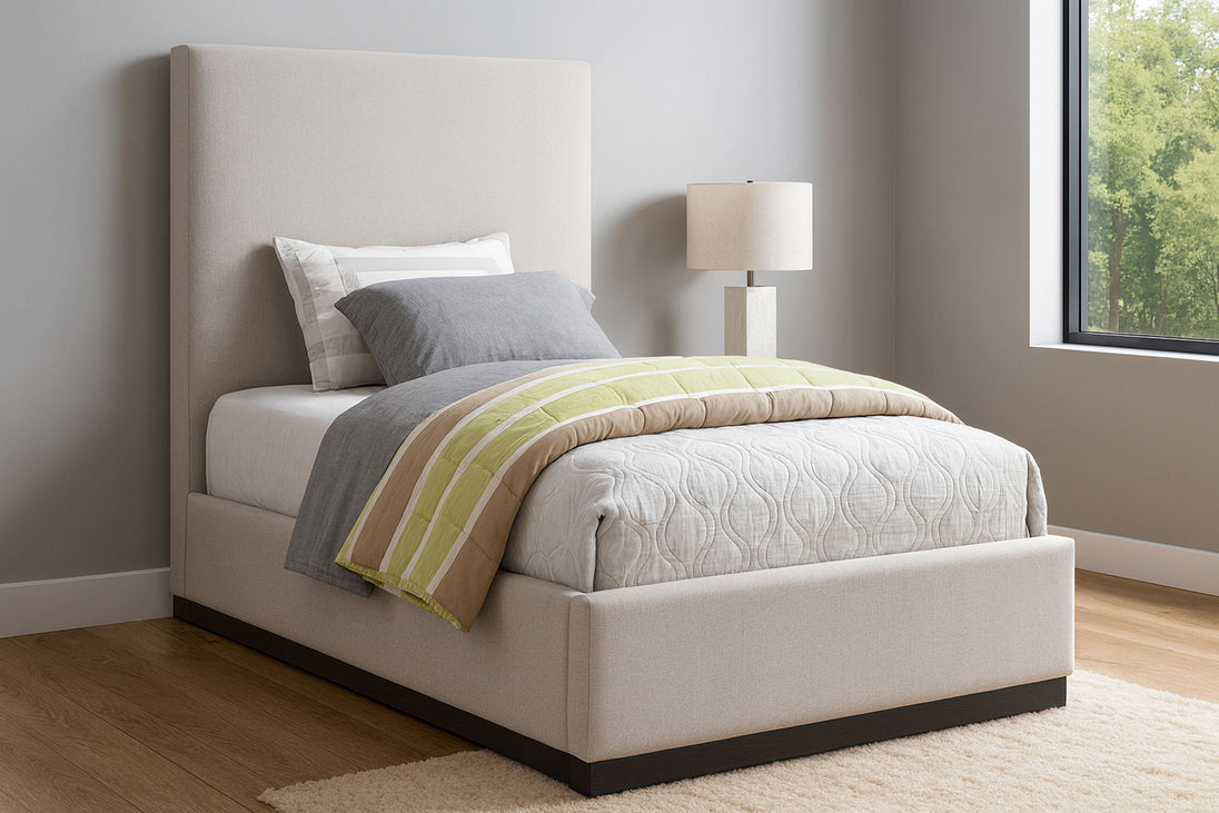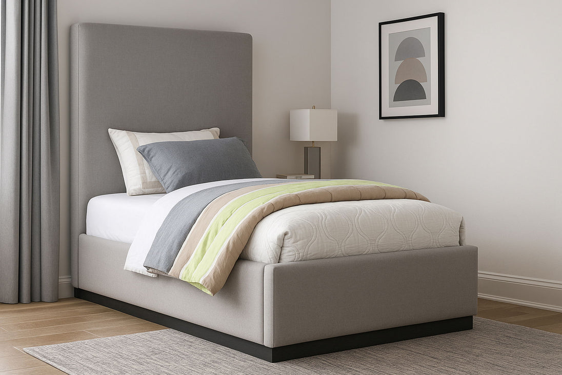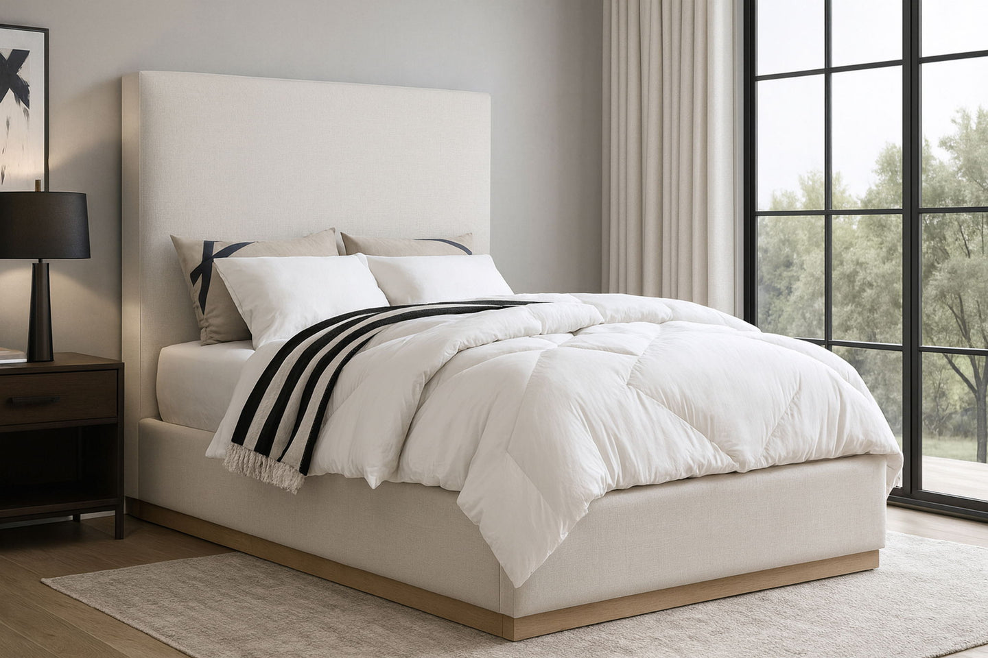 Give your bedroom a regal vibe when you add this Alfie linen textured fabric bed to the mix. The ultra tall headboard on this bed makes a bold impression from all angles and is covered in rich linen textured fabric that forms a pleasant contrast with the black finish solid wood base. The full flat design lets you easily use this bed without a box spring - a top mattress is all that's needed.