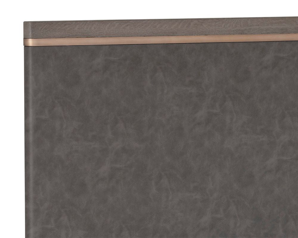 Add character to any resting space with this retro inspired bed crafted in Vietnam. Designed with a faux leather wrapped headboard. A dark grey oak veneer wood frame and a brass stainless steel inlay complete the look. Can be paired with coordinating nightstand, dresser and desk.