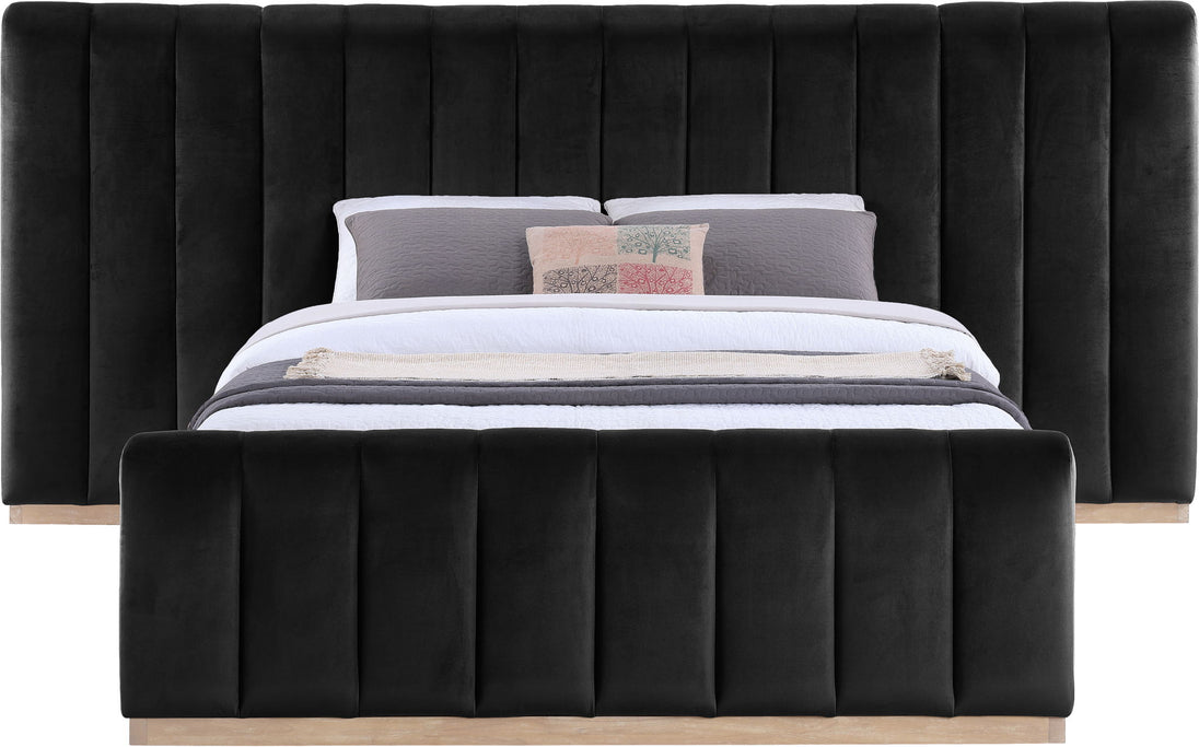 Draped in ultra-luxe 460 GSM velvet, the Amara velvet upholstered king bed exudes elegance and sophistication with its lavish, expansive headboard. Its solid wood inner frame provides lasting durability, complemented by a natural-finish solid wood base for a refined touch. Designed with a sleek contemporary aesthetic, this bed seamlessly blends style and comfort.