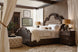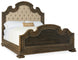This stunning button-tufted upholstered king bed with an elaborately carved and shaped head and footboard imparts an authentic American character. The rich two-tone finish combines an aged black, used in the middle of the generously-scaled footboard, while the timeworn saddle brown finish is used on the carved headboard and the carved border of the footboard.
