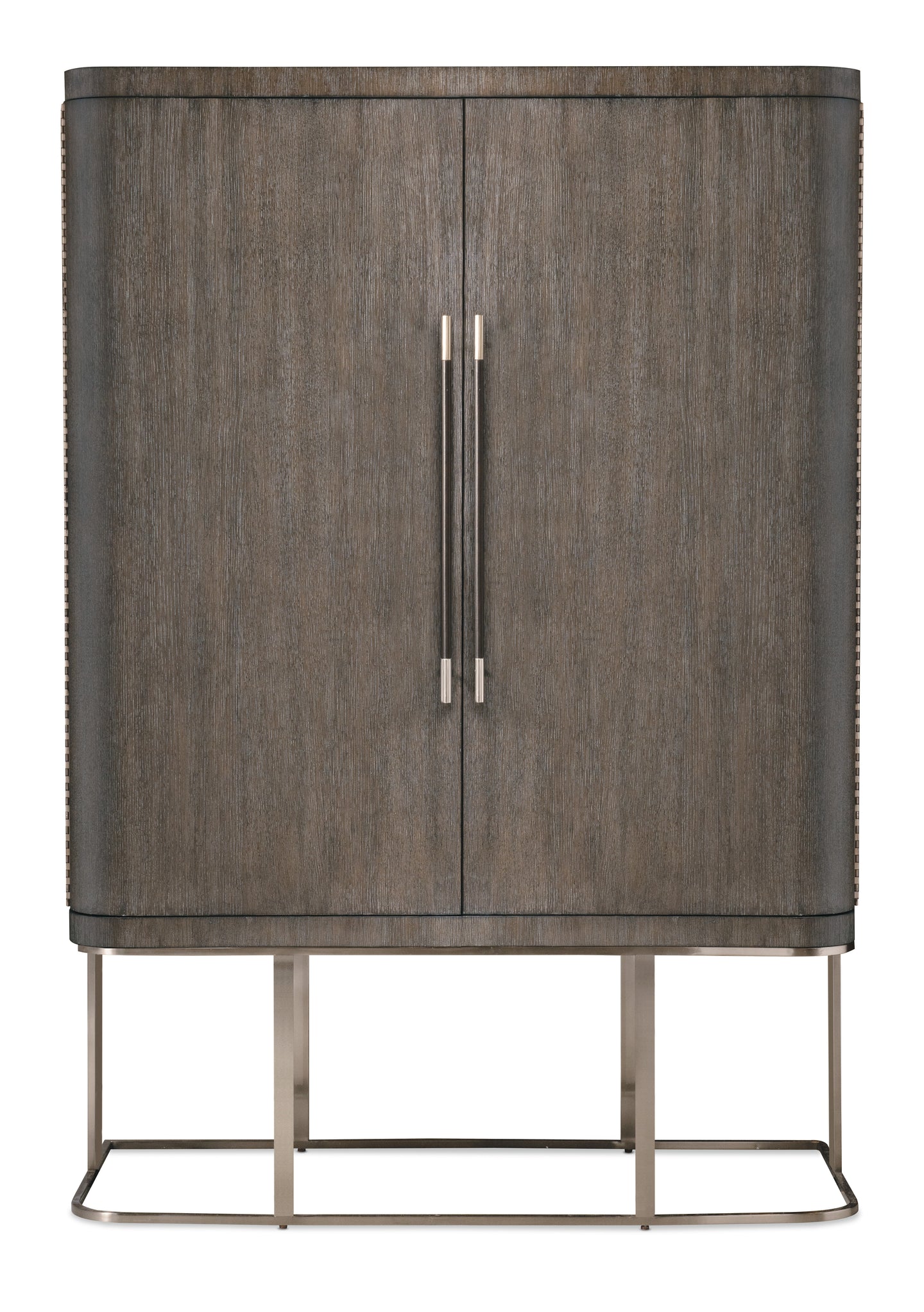 Architectural and timeless with a luxe mixture of materials, the Modern Mood Wardrobe is a statement piece. The shaped metal base gives the cabinet a floating appearance. Crafted with Oak Veneers, the wardrobe is finished in a dark Mink color and has two large wood doors with piano hinges and mirror glass on the back of the right-side door. Behind the right-side doors are two adjustable shelves. Features include six self-closing drawers, a removable clothing rod and jewelry storage behind the left-side doors that includes 26 hooks, three felt-lined trays and one removable drop-in jewelry tray with four padded rows for rings.