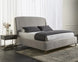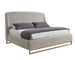 A modern platform bed that offers style and comfort. Features delicate ruching on the rounded headboard and exposed antique brass legs. Stocked in dove cream fabric. Also available in polo club stone performance fabric. No box spring is required and folding slats are included.