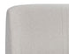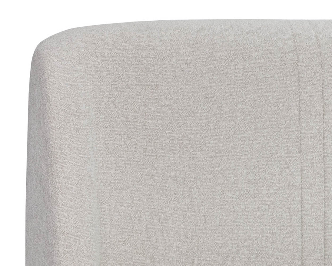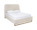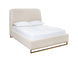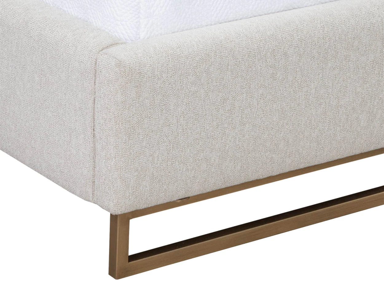 A modern platform bed that offers style and comfort. Features delicate ruching on the rounded headboard and exposed antique brass legs. Stocked in dove cream fabric. Also available in polo club stone performance fabric. No box spring is required and folding slats are included.