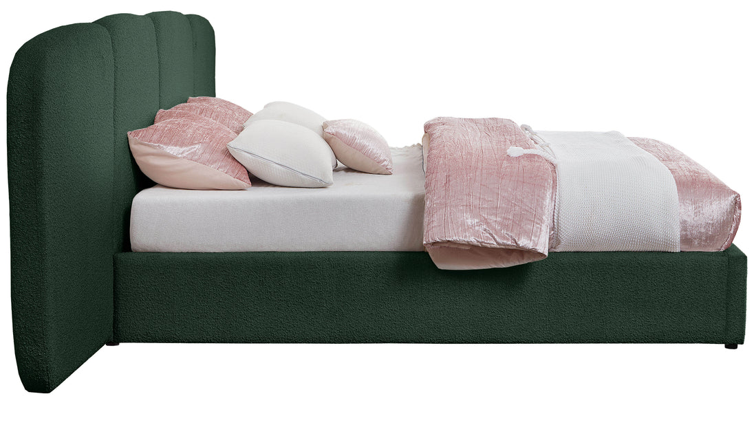 Turn your bedroom into a serene retreat with the exquisite Shiloh Boucle Fabric King Bed. The headboard boasts a stunning art deco design that exudes sophistication and luxury, elevating the ambiance of any space. The plush boucle fabric has a rich Green green tone that is not only visually appealing but also provides a soft and comfortable touch, adding an element of elegance and refinement to your room. With this bed, you can indulge in a resort-like experience right in the comfort of your own home.