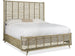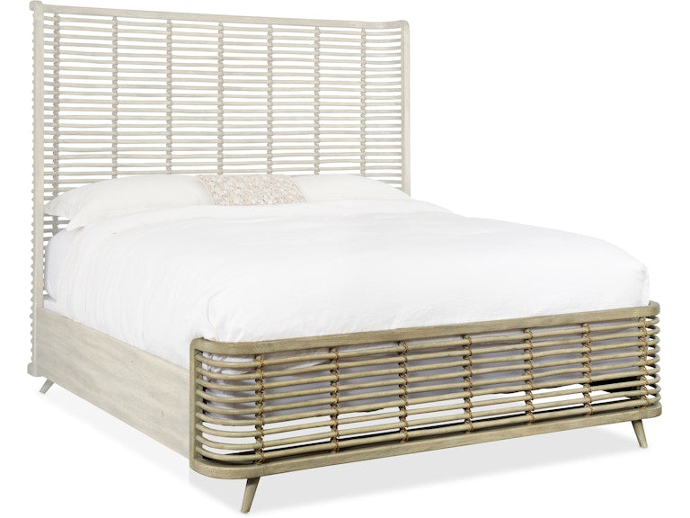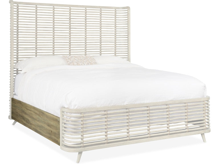 Crafted of Pecan Veneers, Cane, Raffia and hand-tied Jute Rope, the Surfrider King Rattan Bed epitomizes a relaxed California casual lifestyle. The signature bed is finished a light natural finish called Driftwood with distressing including sandblasting and bleaching. Includes the headboard, footboard and rails.