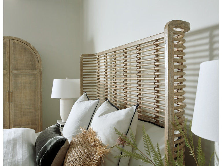 Crafted of Pecan Veneers, Cane, Raffia and hand-tied Jute Rope, the Surfrider Queen Rattan Bed epitomizes a relaxed California casual lifestyle. The signature bed is finished a light natural finish called Driftwood with distressing including sandblasting and bleaching. Includes the headboard, footboard and rails.