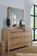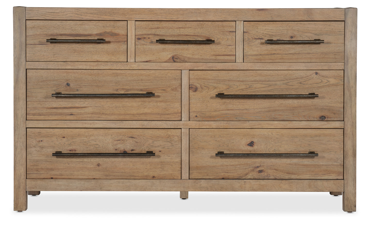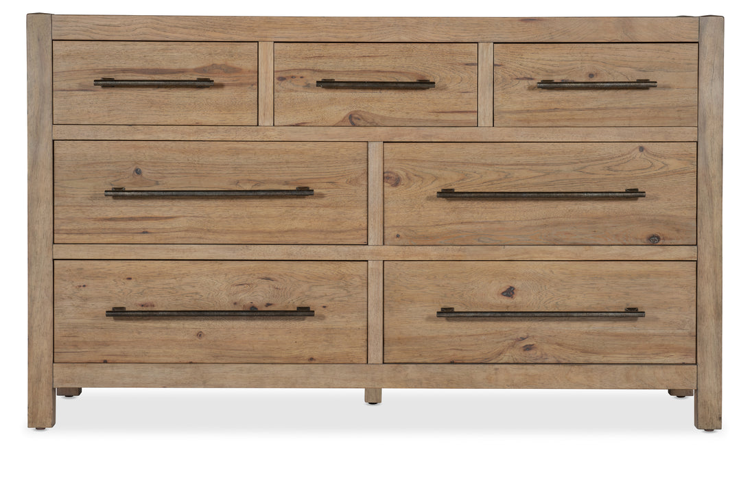 Inspired by California wine country and influenced by the quaint bungalows and craftsman architecture of the region, the Vineyard Row Dresser has 7 self-closing drawers. Crafted of Pecky Hickory and White Oak Veneers with two cedar-lined bottom drawers, it is finished in the light-and-airy Sonoma finish, accented by rustic hammered bar pulls.