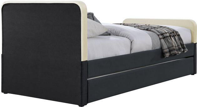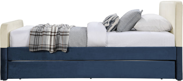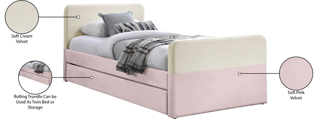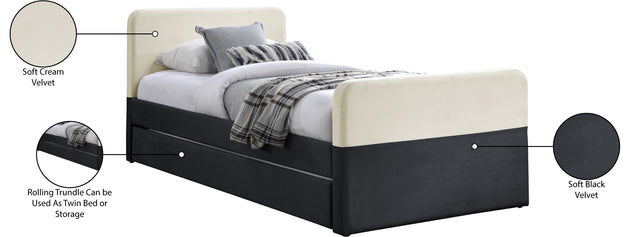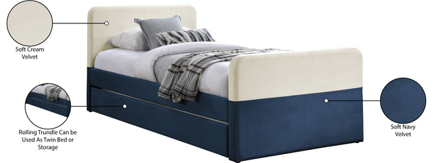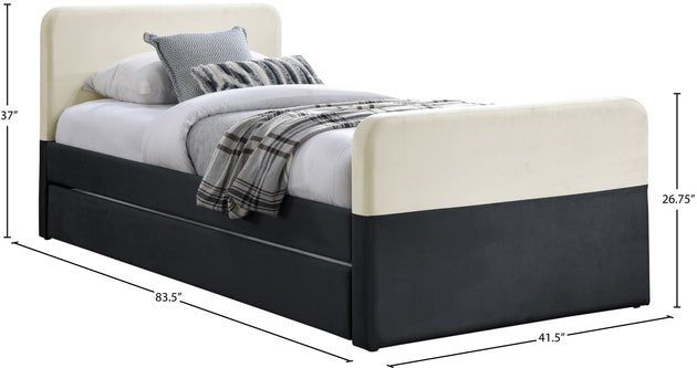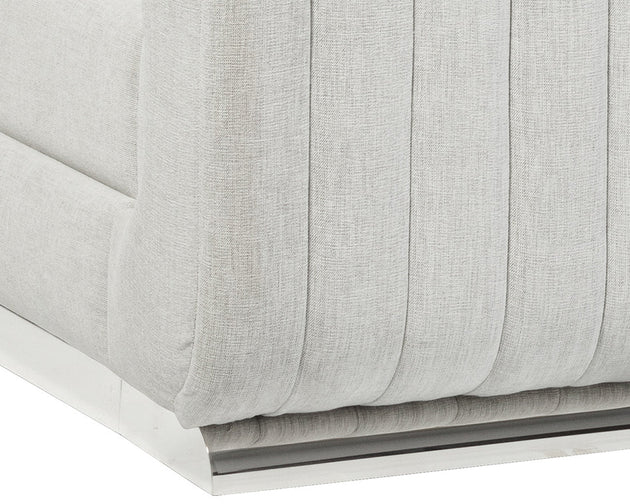 Infinity Bed with diamond folded button tufting and chrome headboard trim and legs