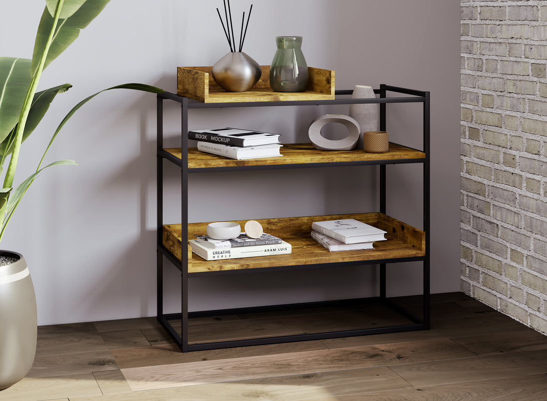 Elevate your space with this modern-industrial console table, where function meets timeless style. Featuring a sturdy black metal frame paired with rich wood-finish shelves, this three-tier piece offers the perfect balance of warmth and structure. The raised-edge shelving design keeps your décor secure while providing ample space for books, decorative accents, or everyday essentials. Whether placed in your entryway, living room, or office, this console table makes a bold yet versatile statement. Its clean lines and earthy tones create a grounded, contemporary look that complements both rustic and urban interiors. Built to last and designed to impress, it’s the ideal piece to organize, display, and inspire.