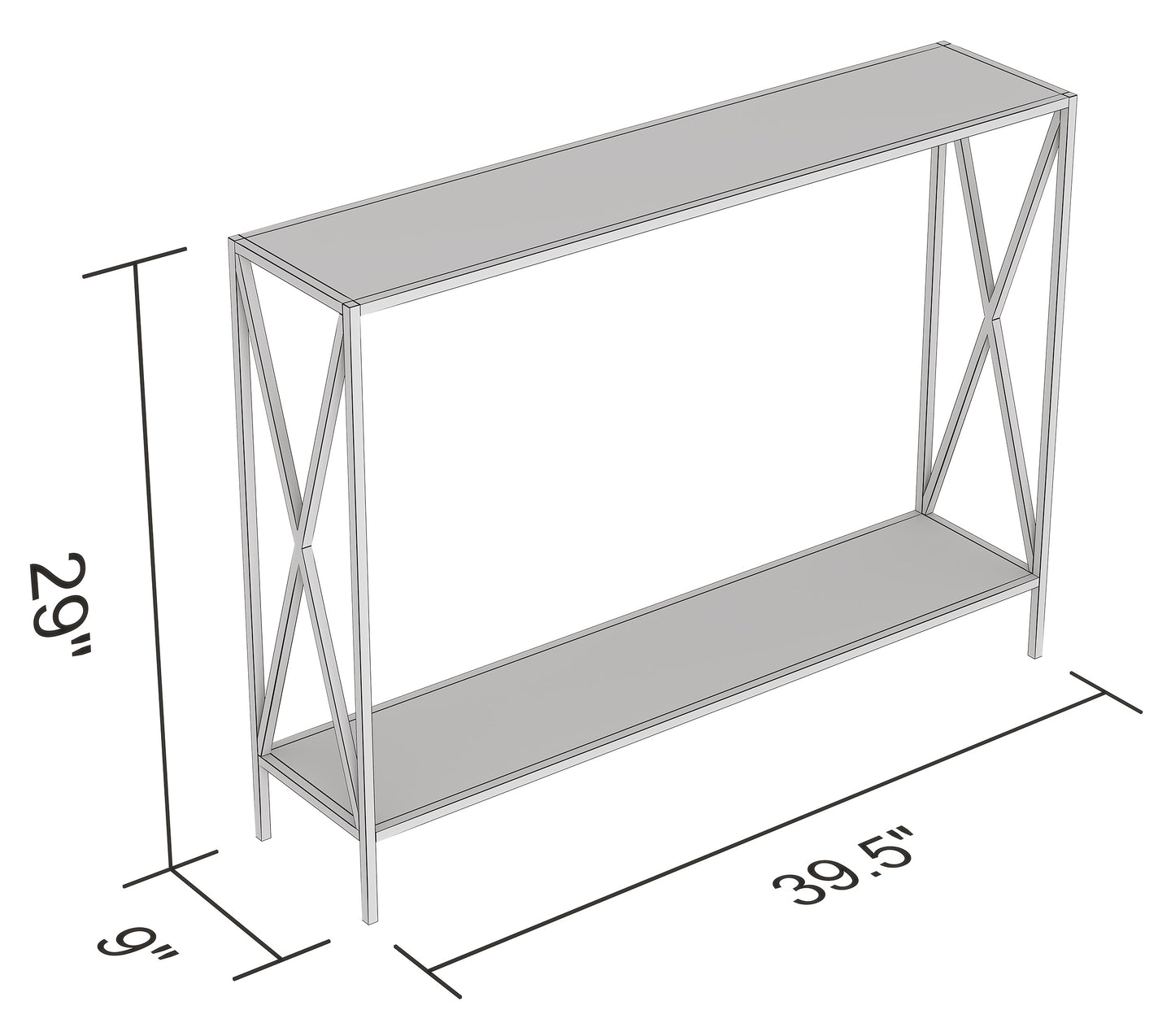 Add a touch of modern charm and everyday function to your space with this 39.5” two-shelf console table—designed to bring style, structure, and versatility into any room of your home. Whether it’s welcoming guests in your entryway, adding personality behind your sofa, or organizing essentials in your bedroom or office, this table is built to do it all with ease. The clean, contemporary design fits seamlessly into any décor, offering both beauty and practicality in one sleek silhouette. With two open shelves, you’ll have plenty of space to display your favorite décor, store books or baskets, or set up a charming coffee station or bar. Its sturdy frame and durable build are made for everyday use, effortlessly supporting your lifestyle while maintaining its stylish look. Use it as a side table, hallway console, TV tray, plant stand, or even a makeup table—the possibilities are endless. Compact yet full of potential, this table is a smart solution for smaller spaces and multifunctional needs. Make your home more inviting, organized, and uniquely you with this stunning, multi-use console table.