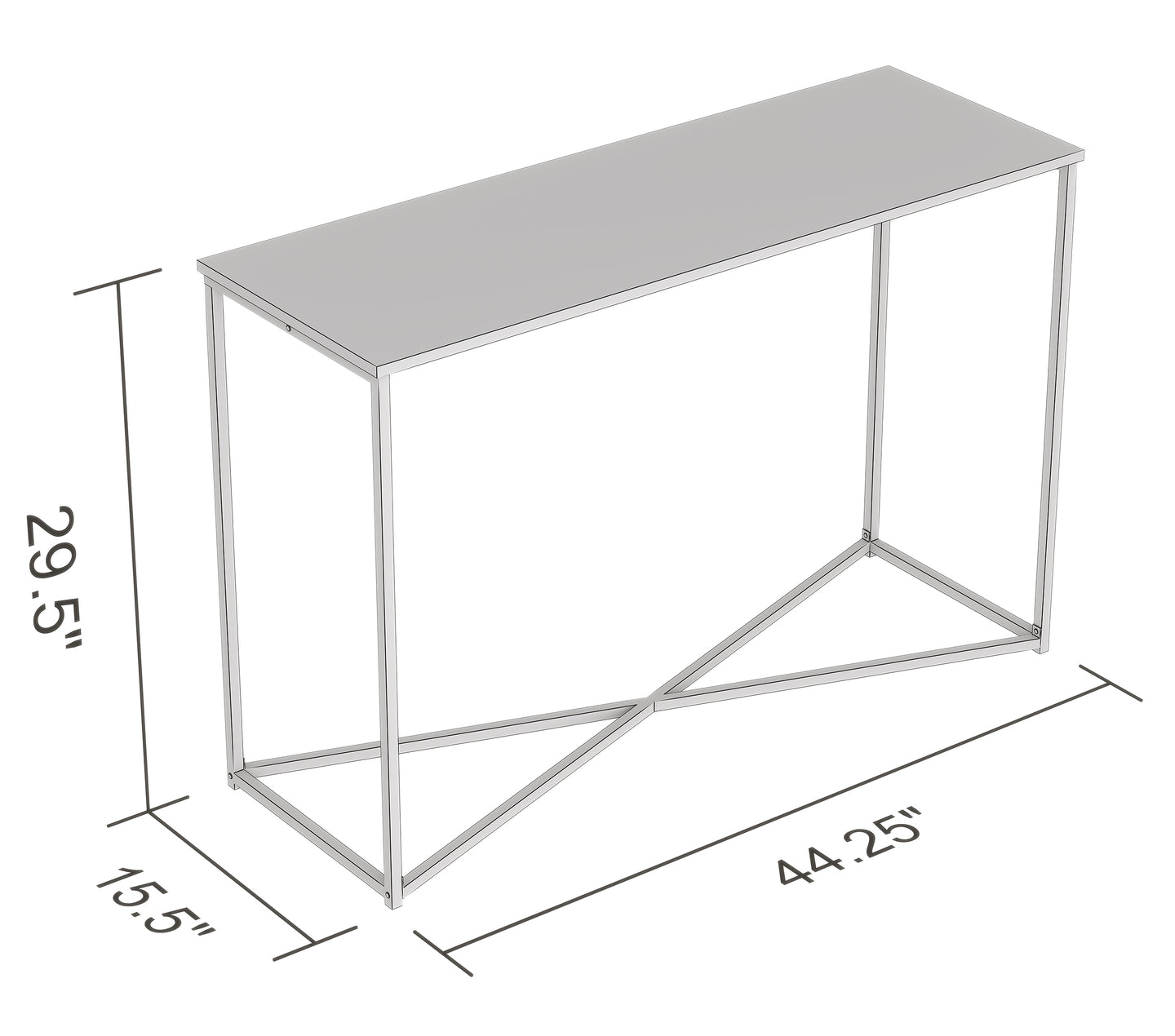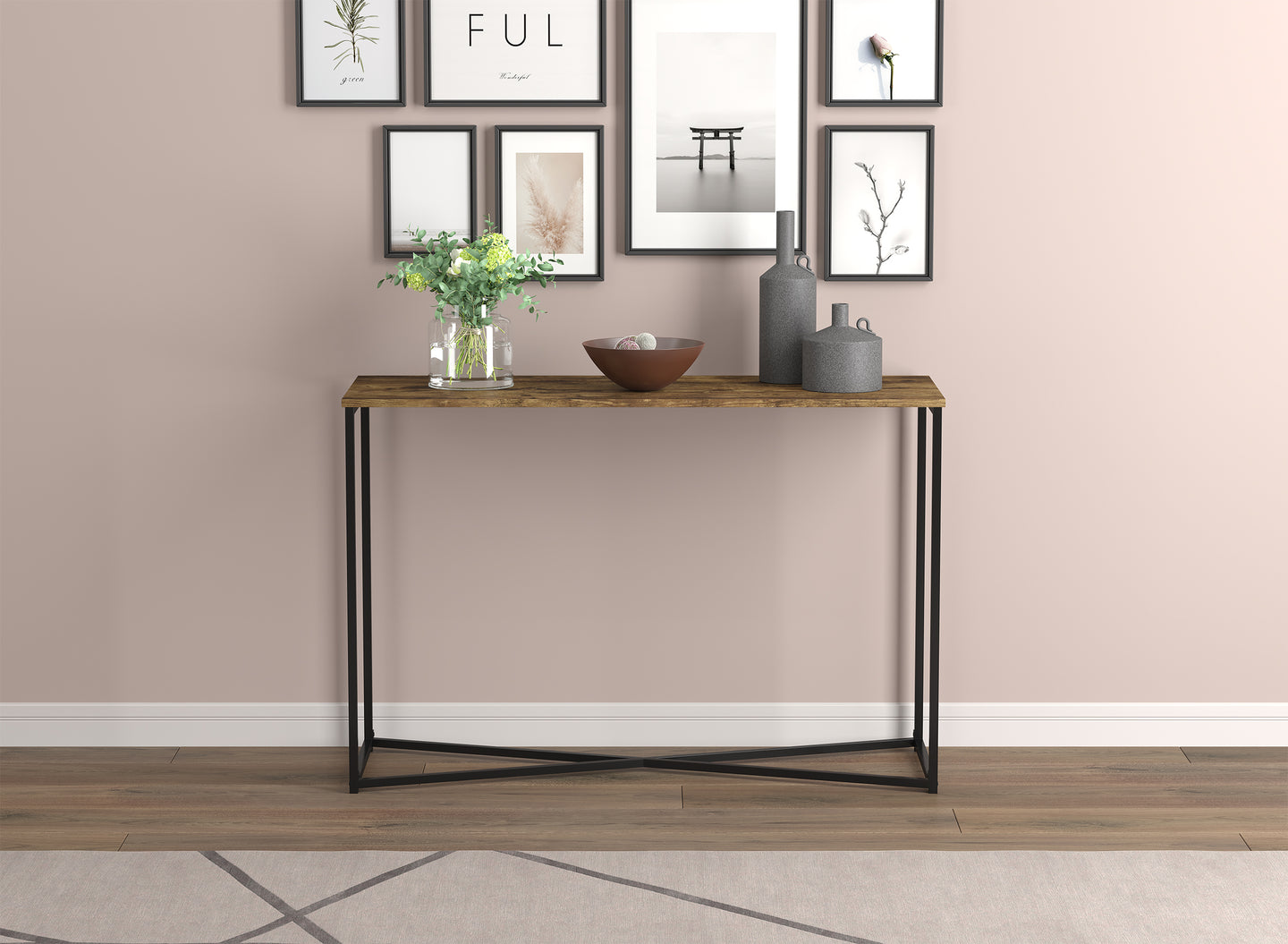 Add a touch of rustic charm and functional elegance to your space with this beautifully designed 44" console table, featuring a bold X-frame metal design. With its timeless silhouette and sturdy construction, this piece is a perfect fit for any entryway, hallway, living room, or home office. Whether your style is modern, farmhouse, or somewhere in between, this console table blends effortlessly into your décor.The spacious tabletop offers the perfect place to display your favorite décor, keep daily essentials within reach, or create a stylish coffee or charging station. Its versatile design also makes it great as a bar table, craft station, or accent piece behind the sofa. Built with durability in mind, this table is made to handle everyday use while maintaining its refined look. The open frame keeps it light and airy—ideal for smaller spaces. Stylish, practical, and endlessly versatile, this console table is a beautiful way to bring both form and function into your home.