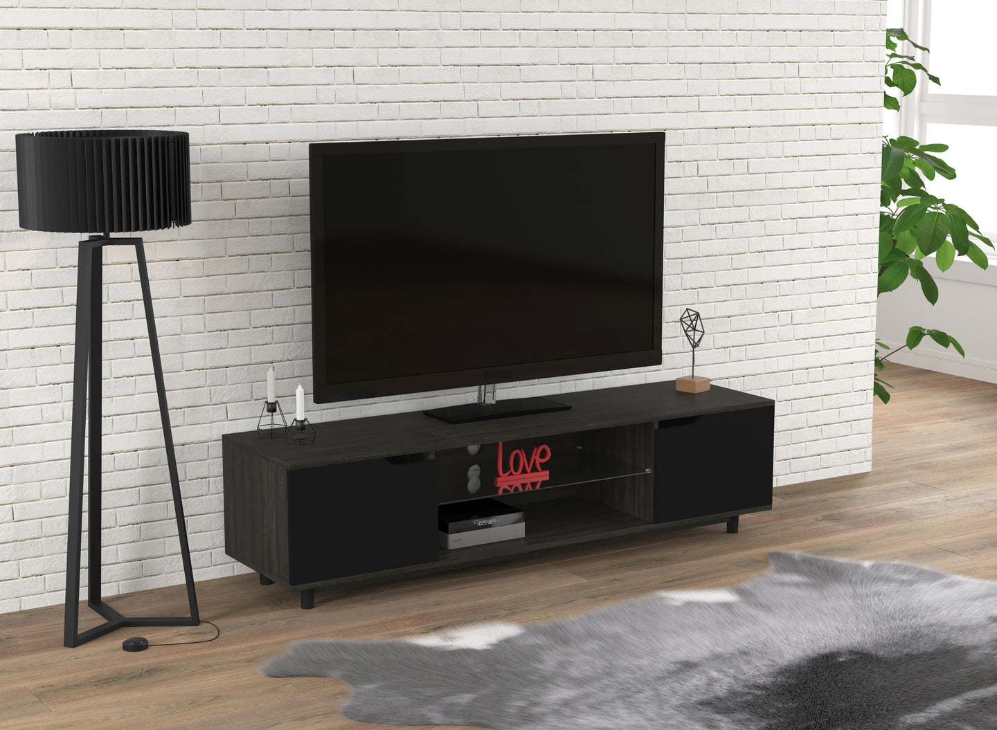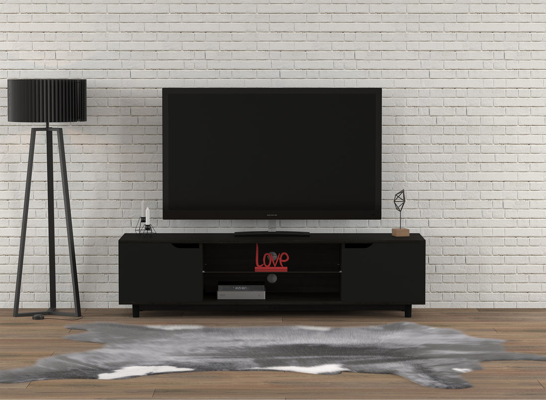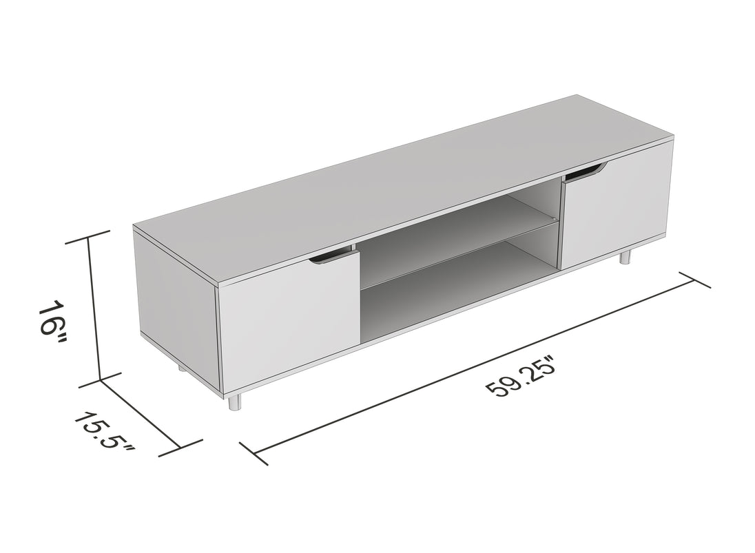 Bring a sense of balance and sophistication to your living room with this beautifully designed 59.25" TV stand, where sleek form meets everyday function. Crafted with a wood-look finish and clean, modern lines, it’s the perfect piece to anchor your entertainment space with style. The generous top easily accommodates your TV, while two open shelves offer space for media consoles, books, or décor.Two framed doors provide hidden storage, keeping your space tidy while adding a touch of bold contrast to the overall design. Whether you're settling in for movie night or hosting friends, this stand offers the perfect blend of practicality and visual appeal. Its versatile look complements both contemporary and transitional interiors, making it a timeless addition to any room. With its sturdy construction and elegant presence, this TV stand is more than just furniture—it’s the centerpiece for your most relaxed and cherished moments at home. Let it transform your space into a sanctuary of comfort and style.