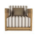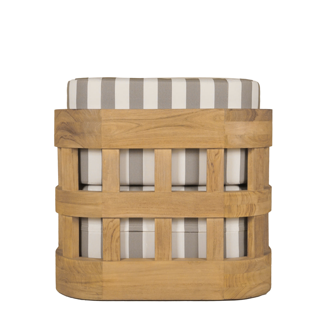 The Adelaide outdoor accent chair infuses the outdoor space with vintage-inspired charm. This contemporary accent chair features a solid teak frame and quick-dry foam cushions upholstered in 100% Olefin fabric. The brown and white striped cushions, accented with a solid tone toss pillow, create visual interest without overwhelming. The curved windowpane detailing nods to vintage designs while maintaining a modern aesthetic.