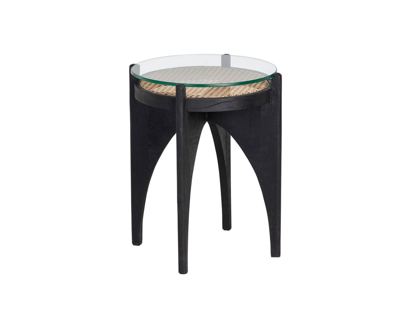 Inspired by global travels, this round end table combines old world influence with modern style. Features natural rattan top covered with clear glass and a sculpted black mango wood base. An intriguing design from all angles. Coordinating coffee table also available. Made in India. With refined craftsmanship, this design was brought to life by skilled local artisans. By nature, these materials develop unique imperfections such as fissures, markings and colour variations for a truly one-of-a-kind piece. Handle With Care: This design has been crafted with rattan. This artisan-crafted material features intricate weaving that results in natural variations where no two pieces are alike. Colour and texture differences are to be expected and embraced with this natural material. Due to the weaving process used, the fibres in this material may display shorter or longer lengths where the weaving ends. Visit our Product Care page for more information on how to ensure the lasting beauty of this piece.