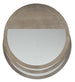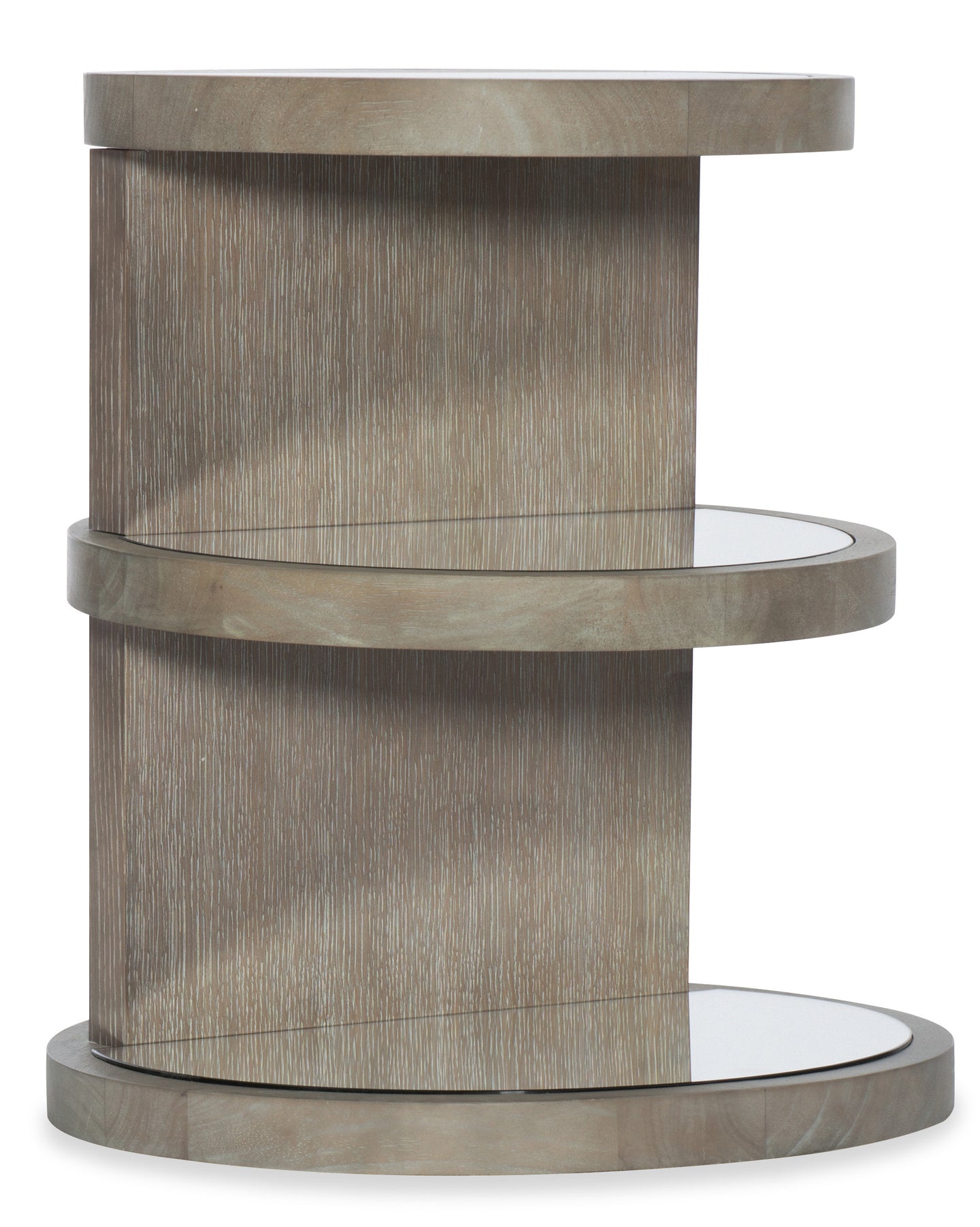 Symmetry and style come together in the Affinity Round Table, featuring three shelves with glass inserts in tapering sizes and a tactile greige sand-blasted finish on Quartered Oak Veneers. The top shelf is 18 ½ wide, the middle shelf is 20 inches wide, and the lower shelf is 22 inches wide.