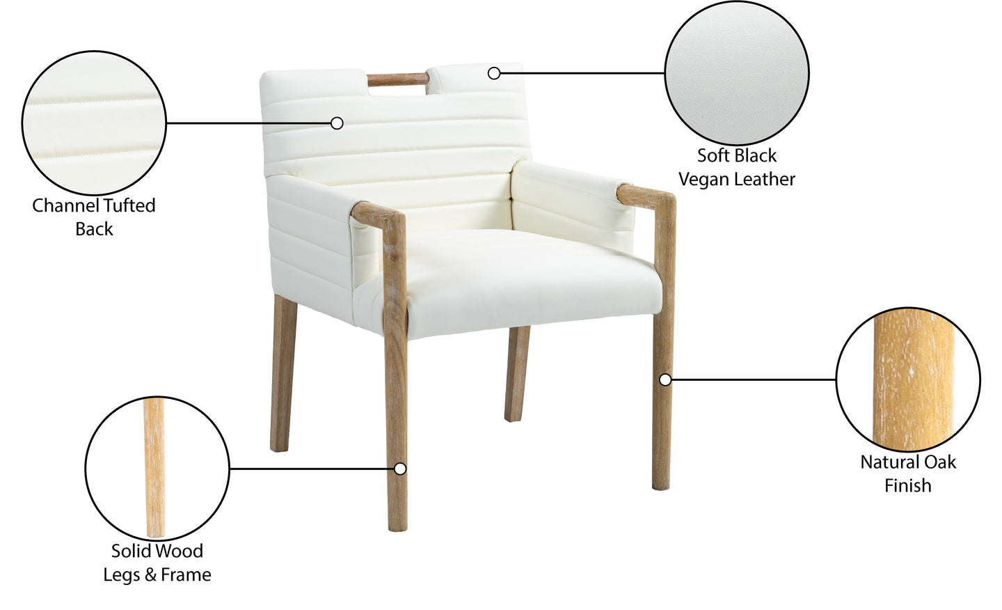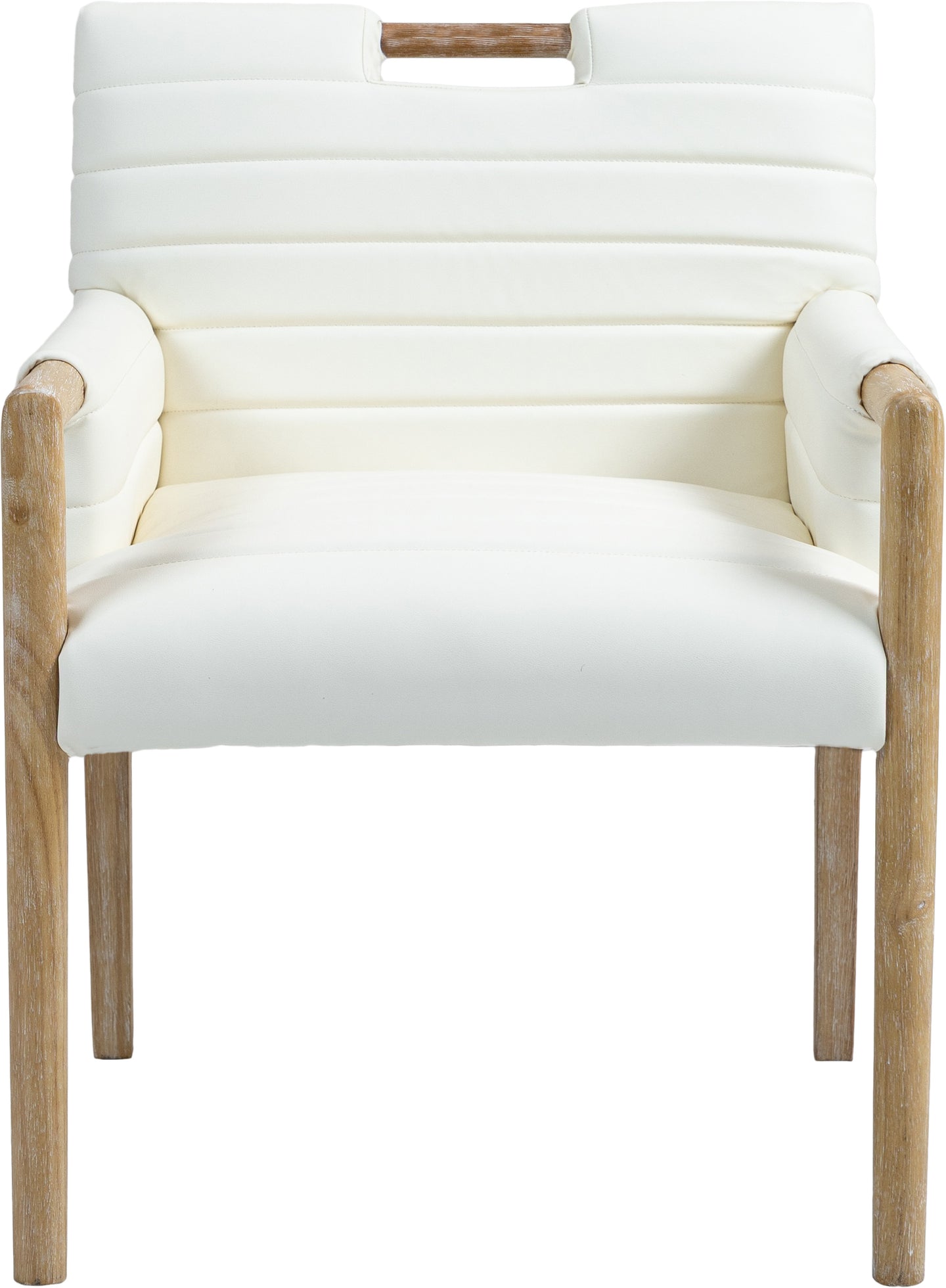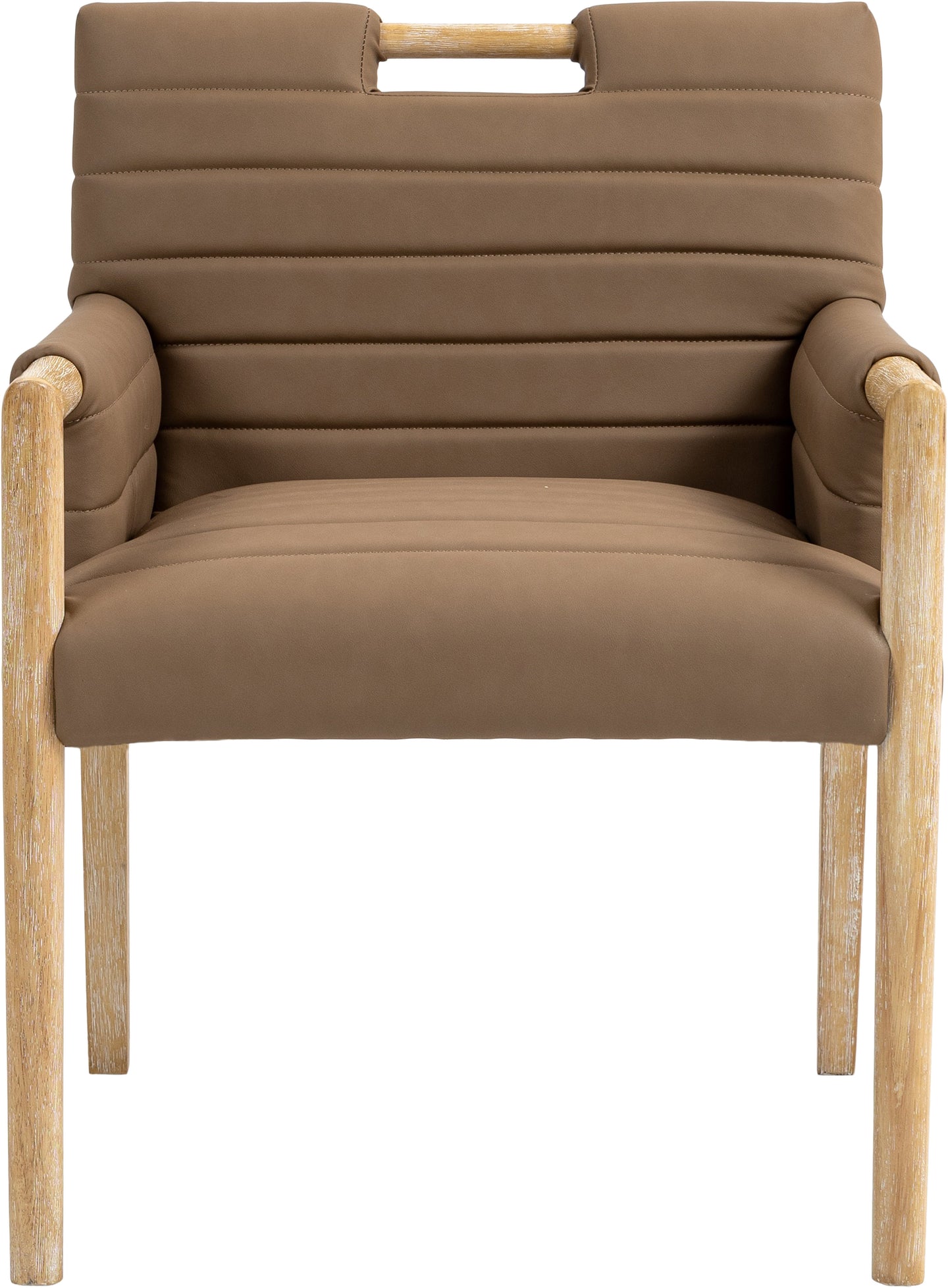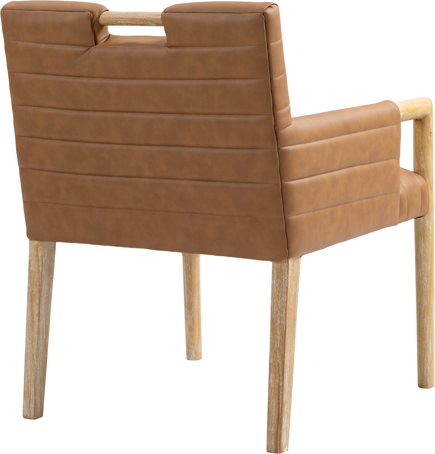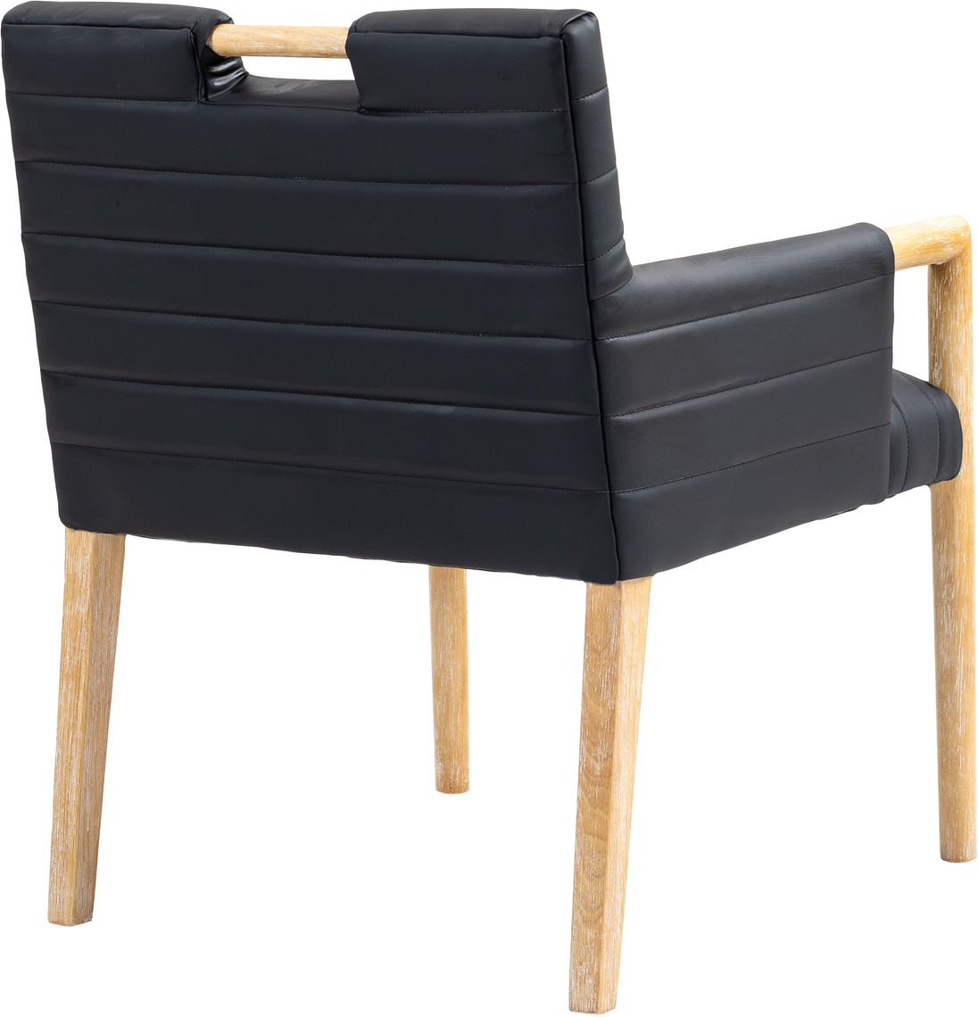 A perfect fusion of modern elegance and eco-friendly luxury is the Aimee vegan leather dining armchair. Upholstered in sleek vegan leather, this chair offers a chic, contemporary look while maintaining a commitment to sustainable living. The padded, quilted design featuring solid natural oak wood legs and armrests creates a stunning contrast between its soft upholstery and minimalist frame.