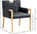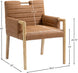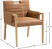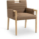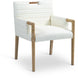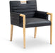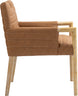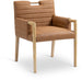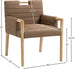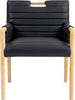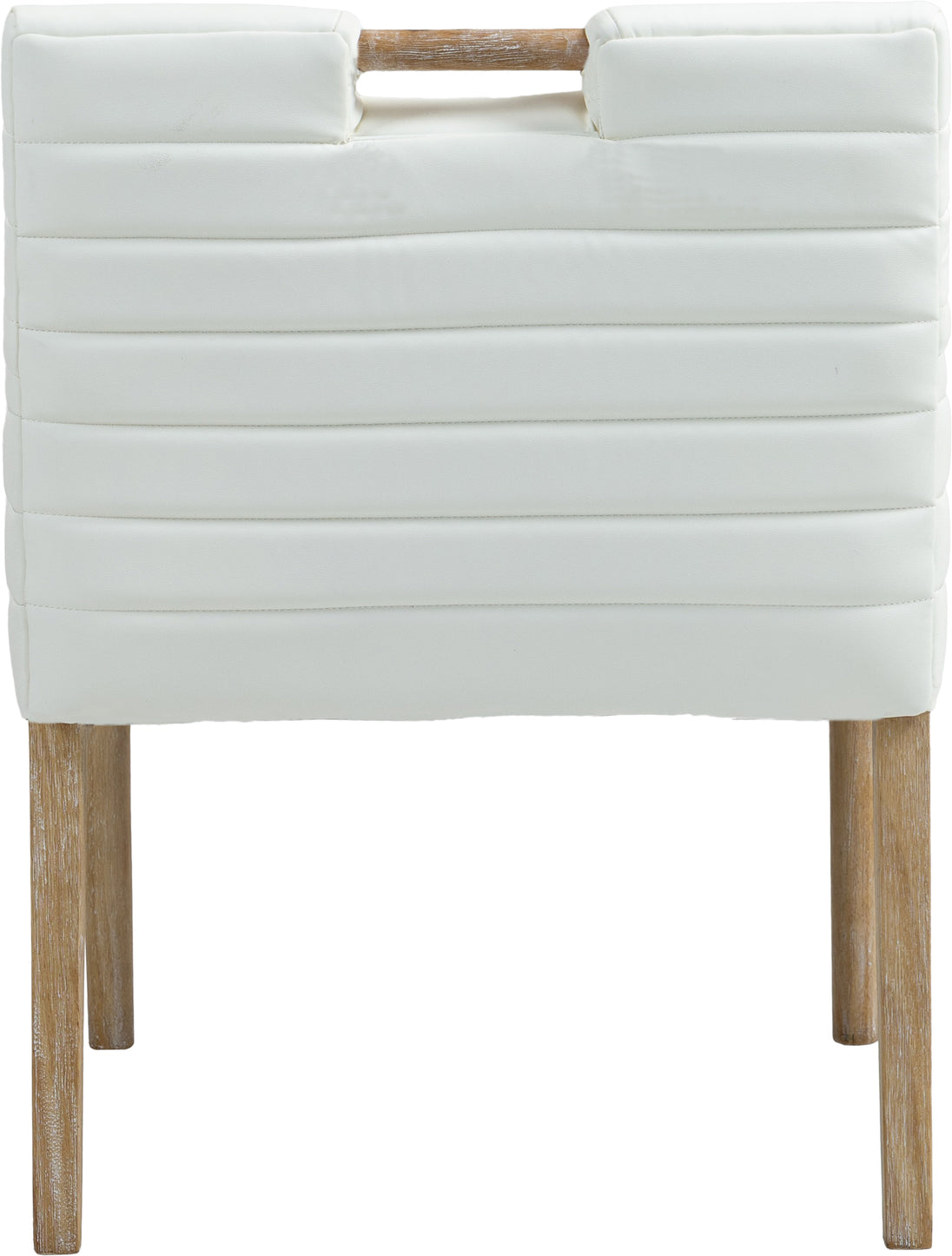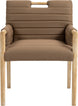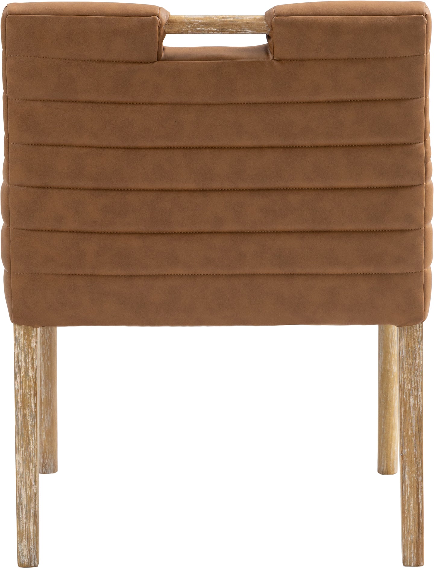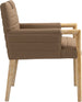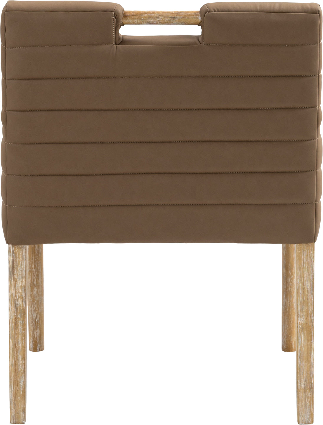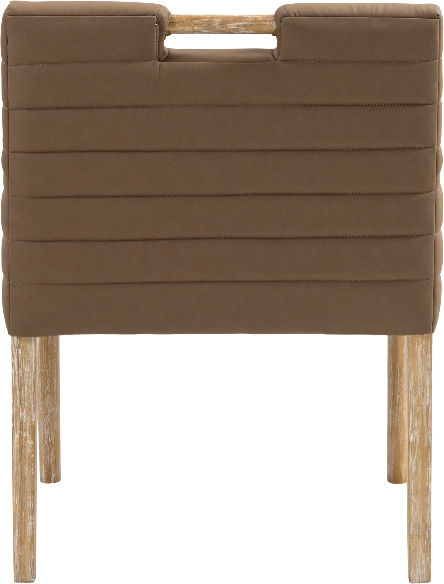 A perfect fusion of modern elegance and eco-friendly luxury is the Aimee vegan leather dining armchair. Upholstered in sleek vegan leather, this chair offers a chic, contemporary look while maintaining a commitment to sustainable living. The padded, quilted design featuring solid natural oak wood legs and armrests creates a stunning contrast between its soft upholstery and minimalist frame.