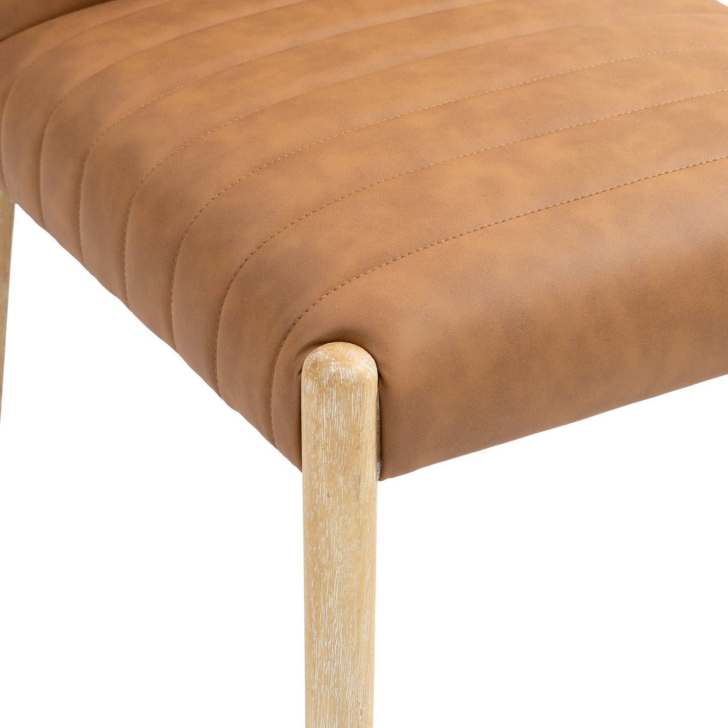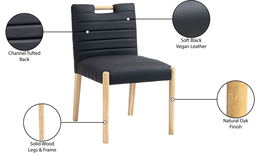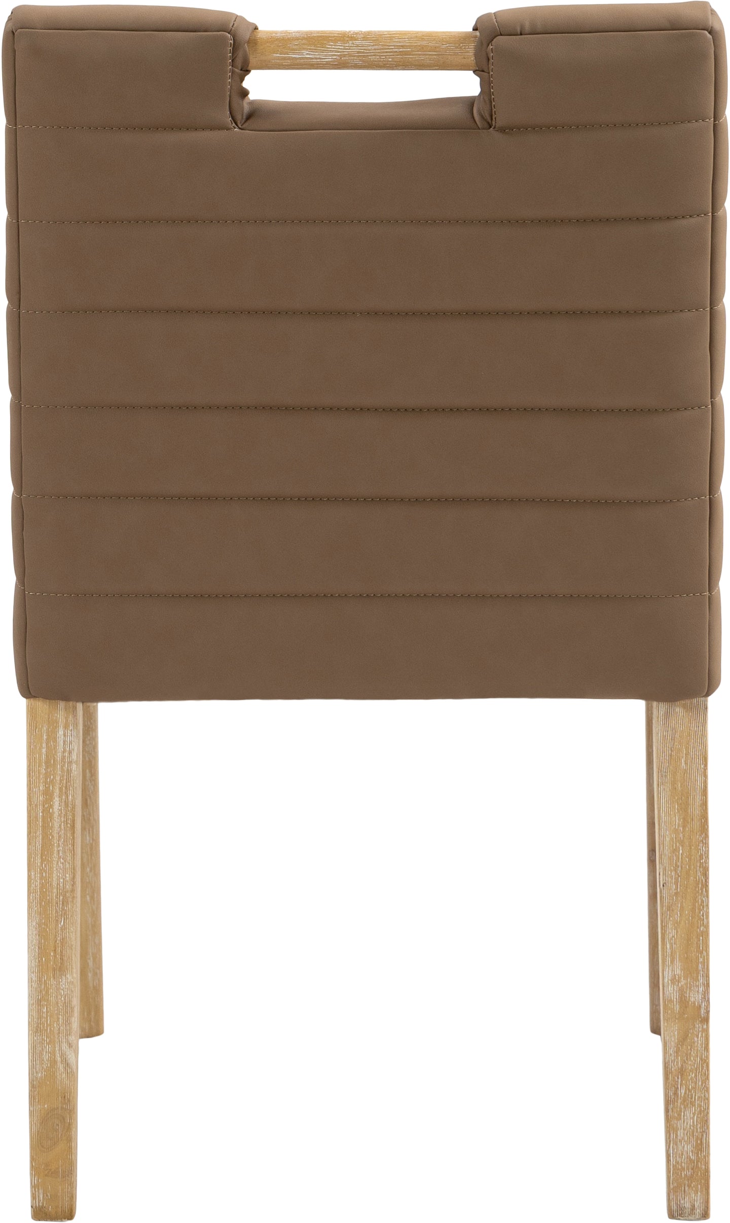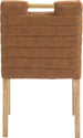 A perfect fusion of modern elegance and eco-friendly luxury is the Aimee vegan leather dining side chair. Upholstered in sleek vegan leather, this chair offers a chic, contemporary look while maintaining a commitment to sustainable living. The padded, quilted design featuring solid natural oak wood legs creates a stunning contrast between its soft upholstery and minimalist frame.