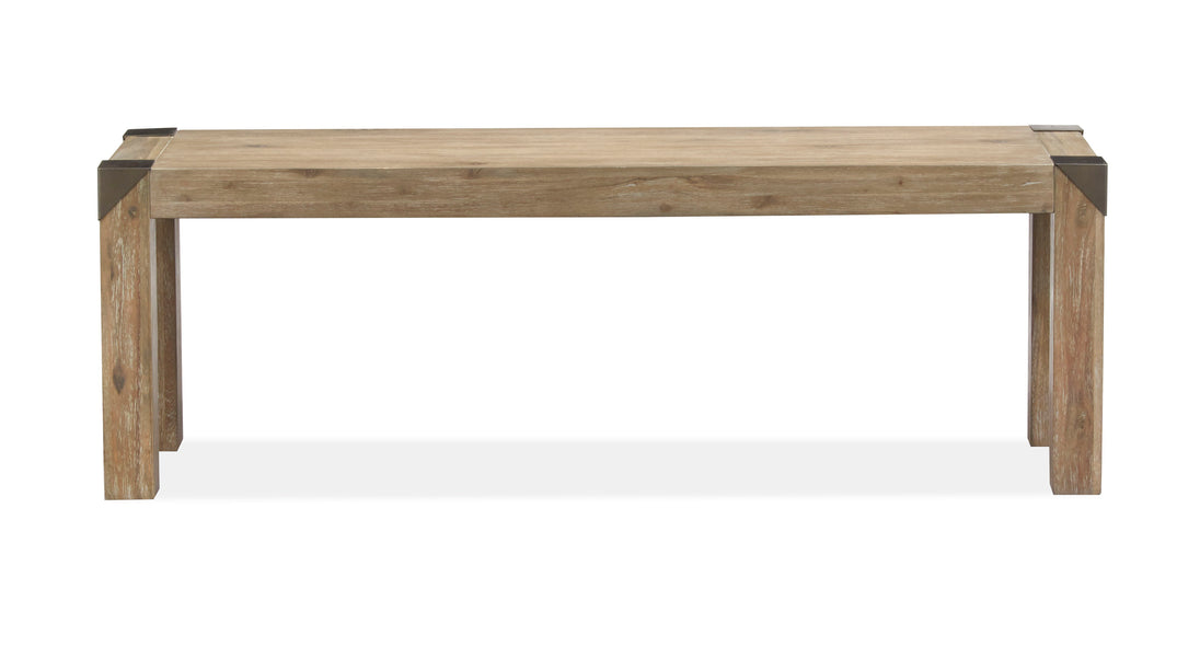 Industrial style gets a light and airy vibe with the soft organic color palette of the Ainsley Dining Collection, featuring a tactile Cerused Khaki finish with a subtle gray wash on exotic, elegant Acacia Solids and Veneers. Adding character to this collection are exquisite book-matched veneers in an X-motif on case fronts, metal ferrules on the base of the round dining table and metal brackets on the edges of the rectangular Parson’s leg Dining Table and the Parson’s Leg Bench, all in an Industrial Bronze finish. The Display Cabinet combines the book-matched pattern at the bottom of the two doors with glass on the top of each door. Chair choices in the collection include a modified Windsor chair with an upholstered seat and upholstered host and side chairs. Create an uplifting setting in soothing natural colors and textures for memorable meals with the Ainsley Collection.