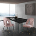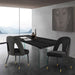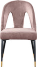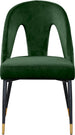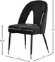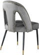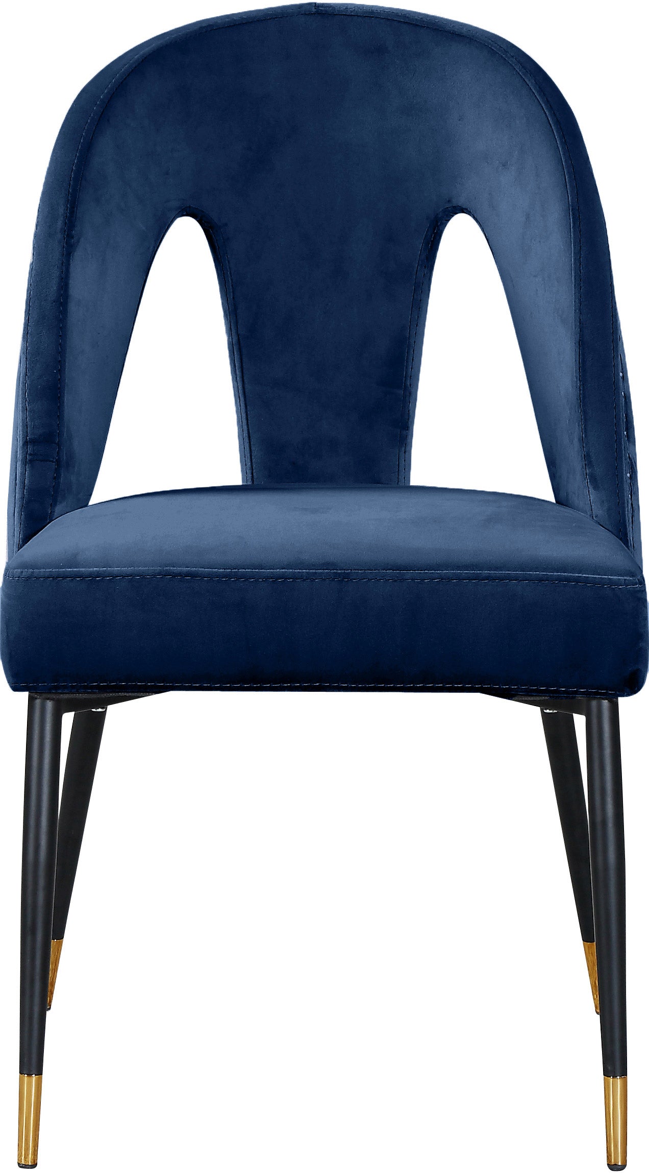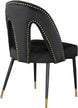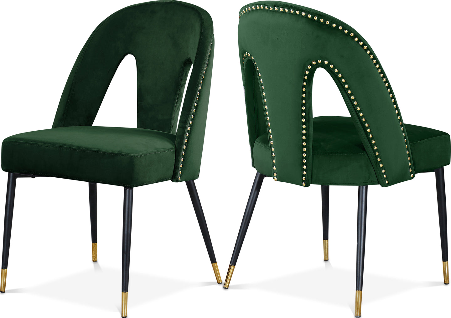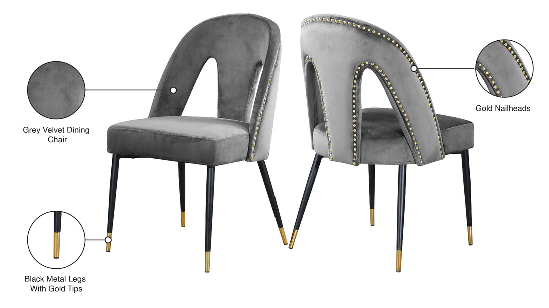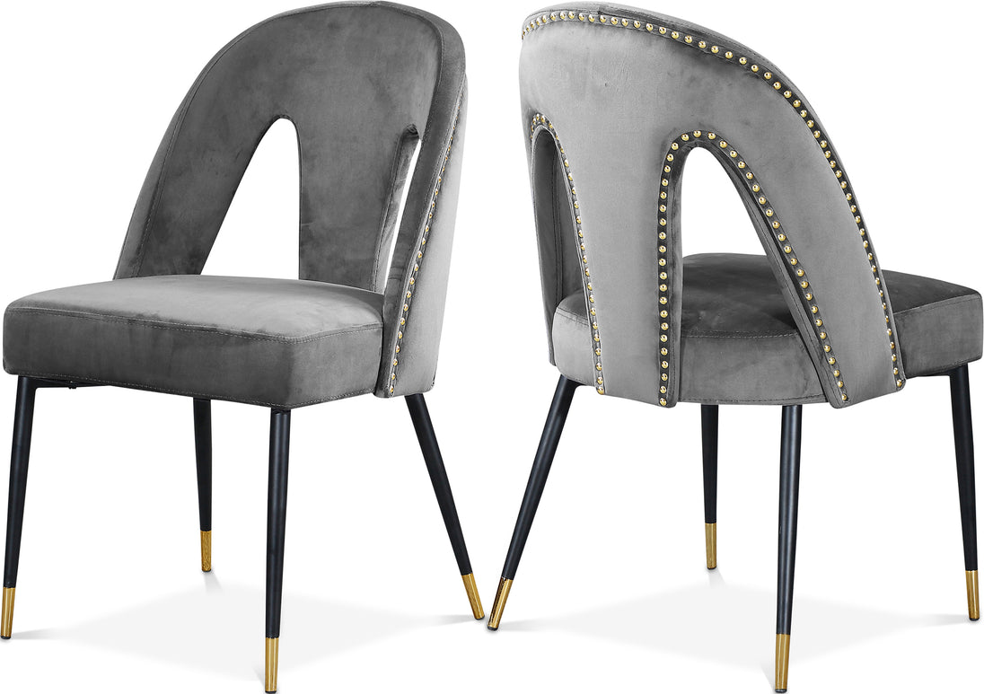 Modern and traditional elements collide in the design of this Akoya Velvet Dining Chair. Velvet upholstery covers the back and seat, giving it a decidedly glamorous look while two strategic cutouts provide just a hint of bold, modish fun. The gold nailhead trim on the back adds an edgy vibe, and metal legs in a black finish with goldtone tips rounds out the dining chair providing sturdy support and a contemporary look.