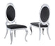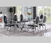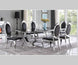 The large 94" rectangular top is finished in black with silver legs, flaunted in a ring-like circular design atop two silver-tiered bases. Paired with a set of modern PU chairs in white, this dazzling table is an amazing centerpiece of any dining room.