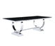 The large 94" rectangular top is finished in black with silver legs, flaunted in a ring-like circular design atop two silver-tiered bases. Paired with a set of modern PU chairs in Black, this dazzling table is an amazing centerpiece of any dining room.